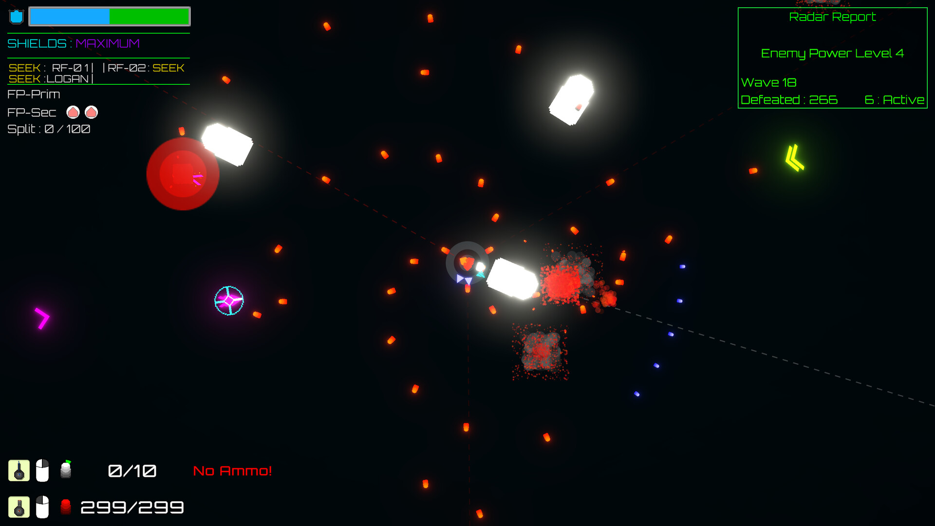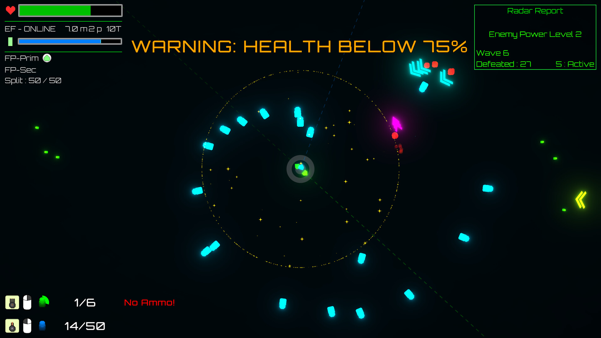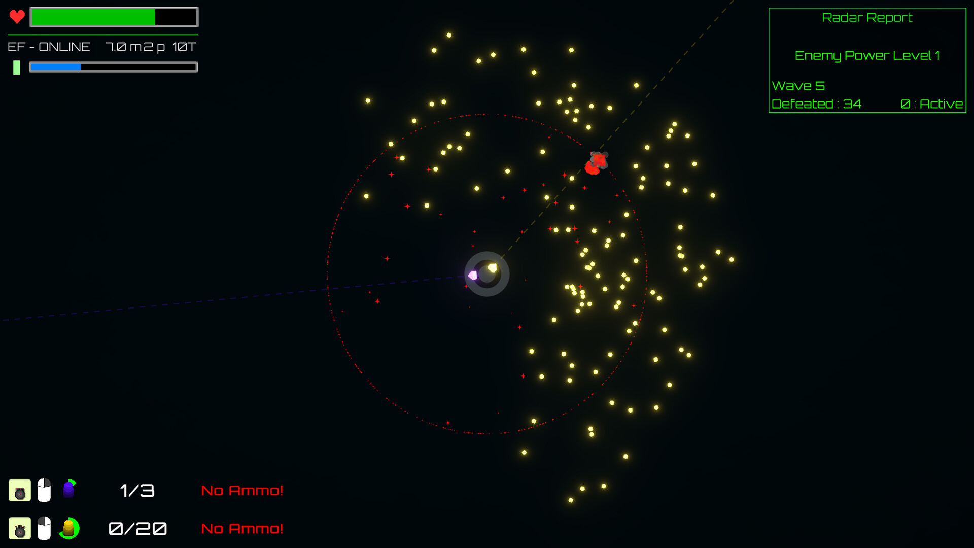 With each wave, enemy ships will fly towards your Starbase in their aim to destroy it. It begins with small groups, becoming dozens, before finally becoming overwhelming hordes. After clearing a wave, you select a Starbase upgrade permenantly powering up your Weapons or Utilities - At least until you finally crumble under the endless foes.