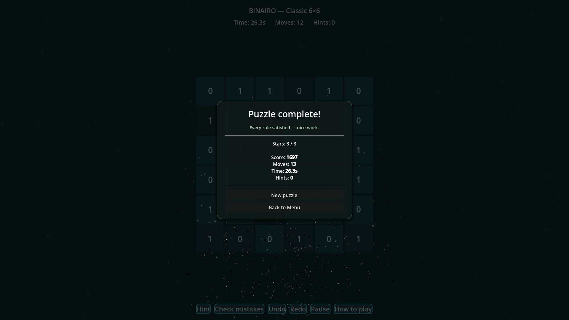 Challenge your logic with this beautiful and addictive binary puzzle game. Fill the grid with 0s and 1s while obeying three simple rules: no more than two identical numbers in a row or column, exactly the same number of 0s and 1s in every row and column, and no duplicate rows or columns. Every puzzle has a unique solution.