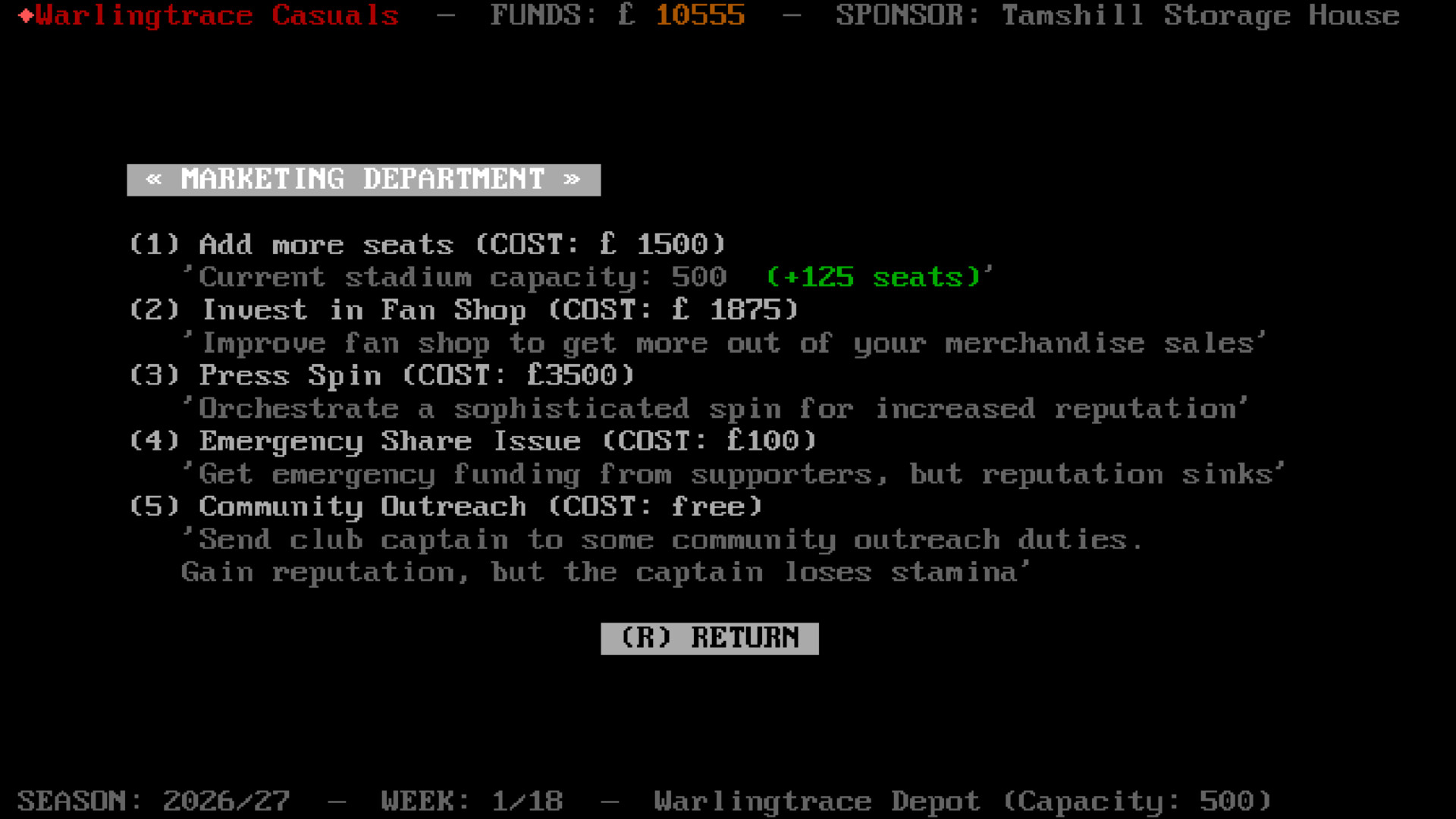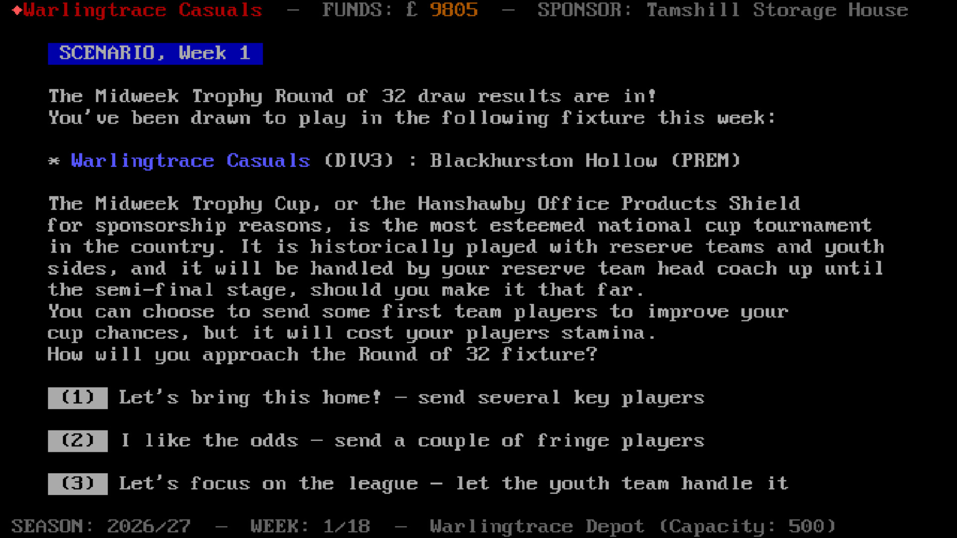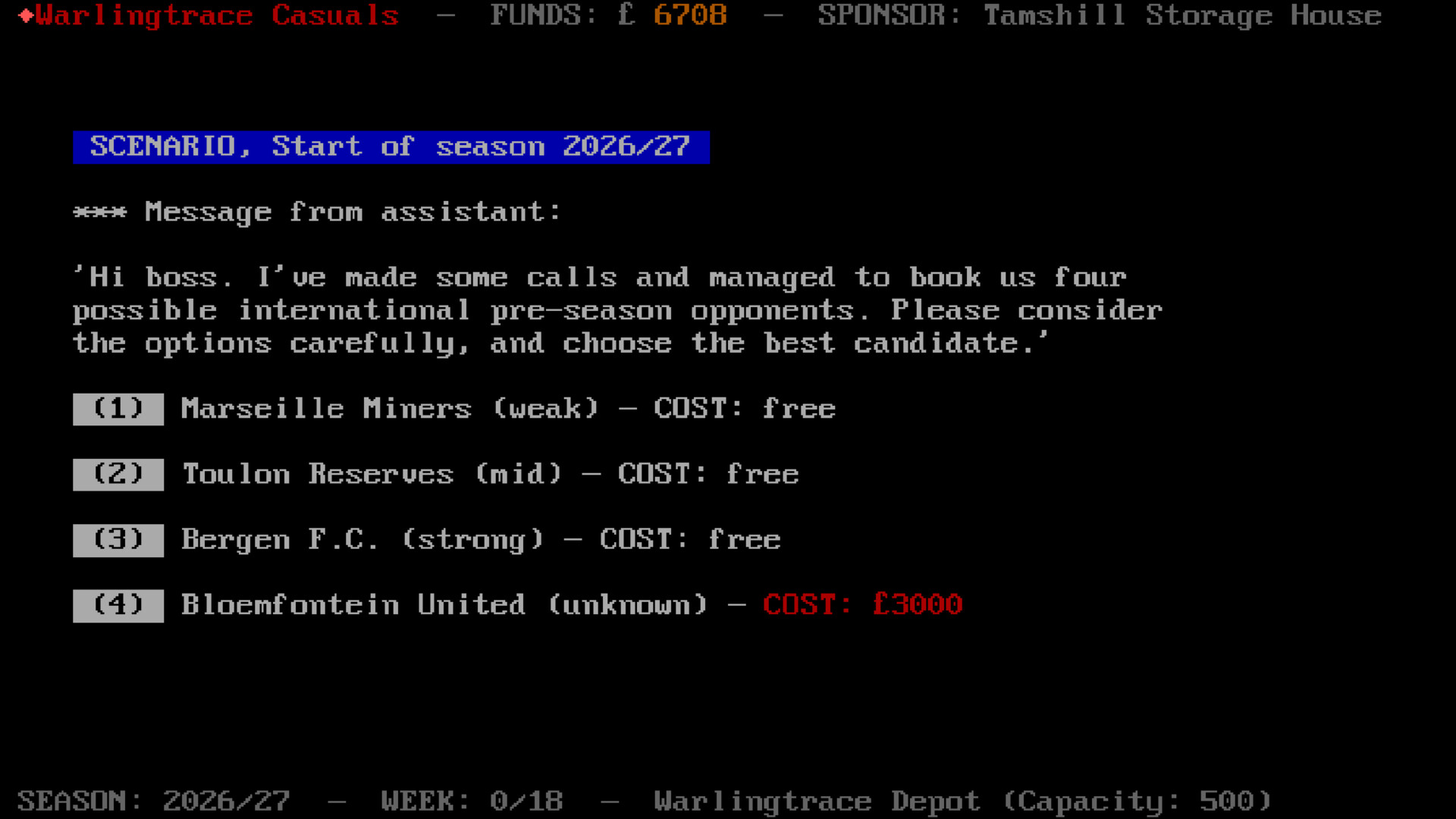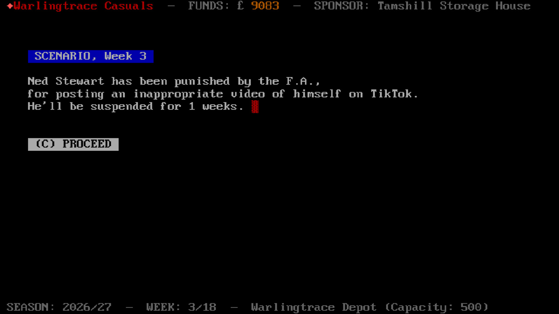 Every week brings new scenarios that can affect your club’s money, reputation, stamina, suspicion, and more. Some are small moments of club life. Others evolve into bigger season-long questlines with branching outcomes.