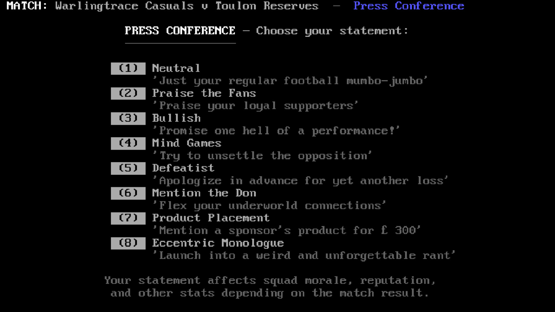Manage transfers, youth development, finances, stadium growth, press conferences, derby days, and weekly club-life scenarios in a world full of random events, branching storylines, and shady opportunities. Every career unfolds differently, with new clubs, players, names, rivalries, and off-pitch drama in every save.