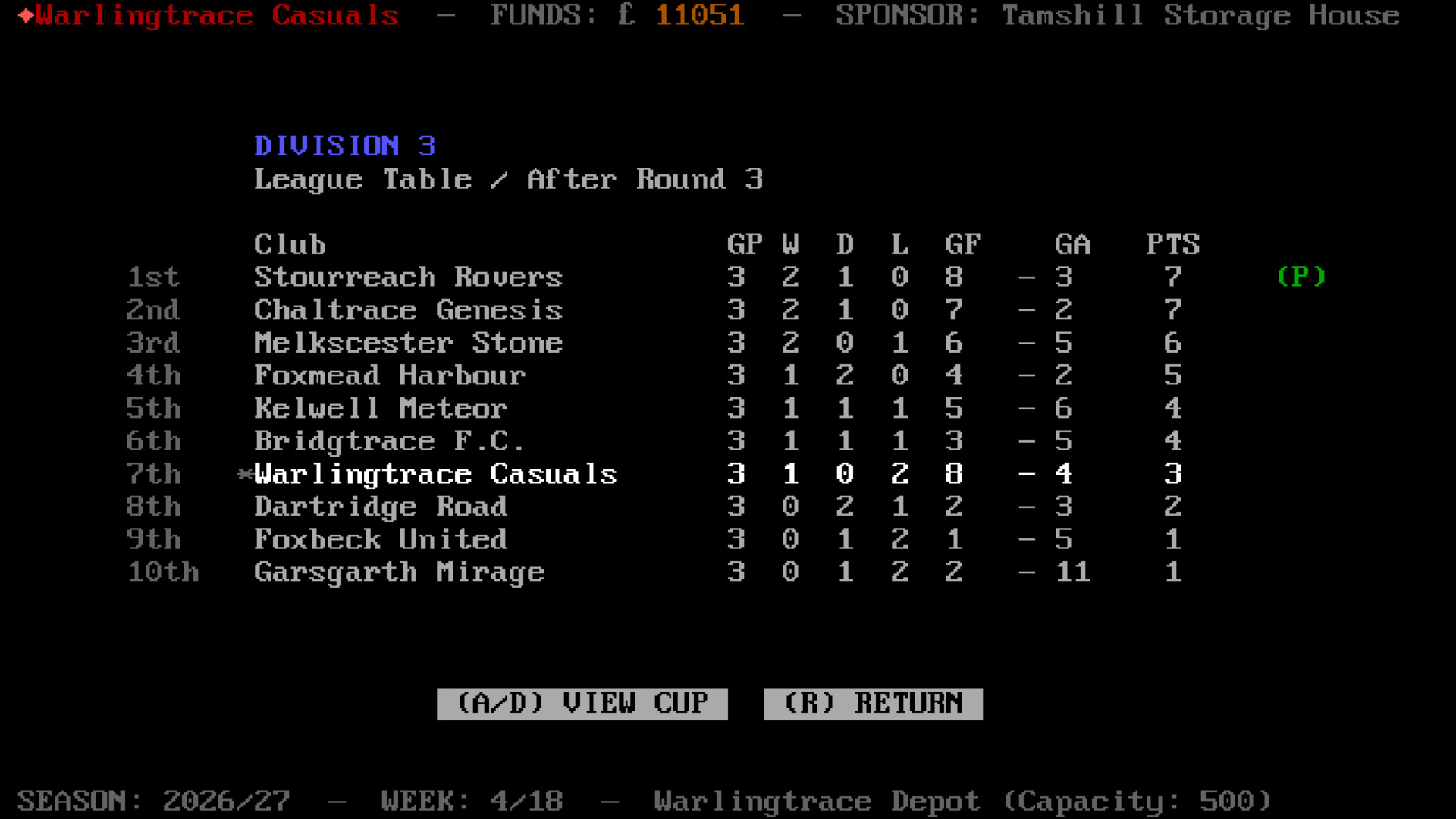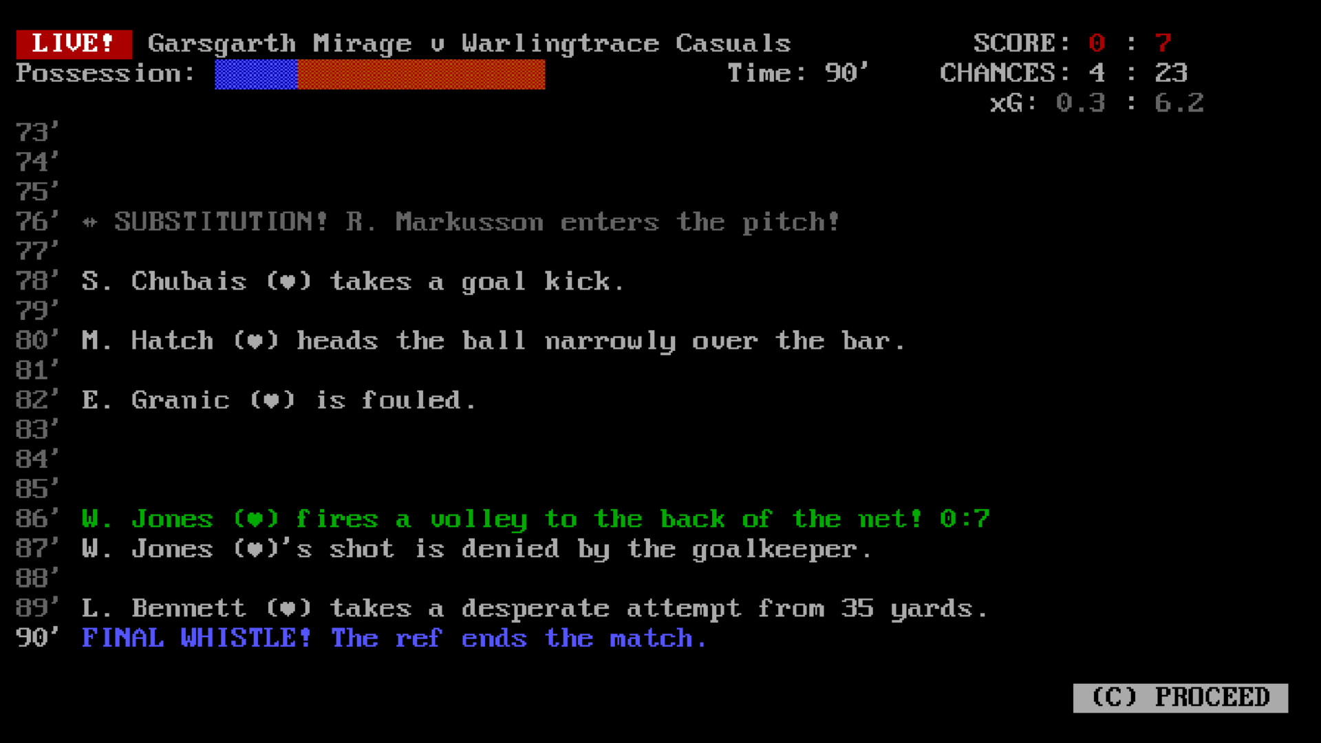 Matches are presented through a compact live commentary match centre, built to keep the season moving while still making every result matter.