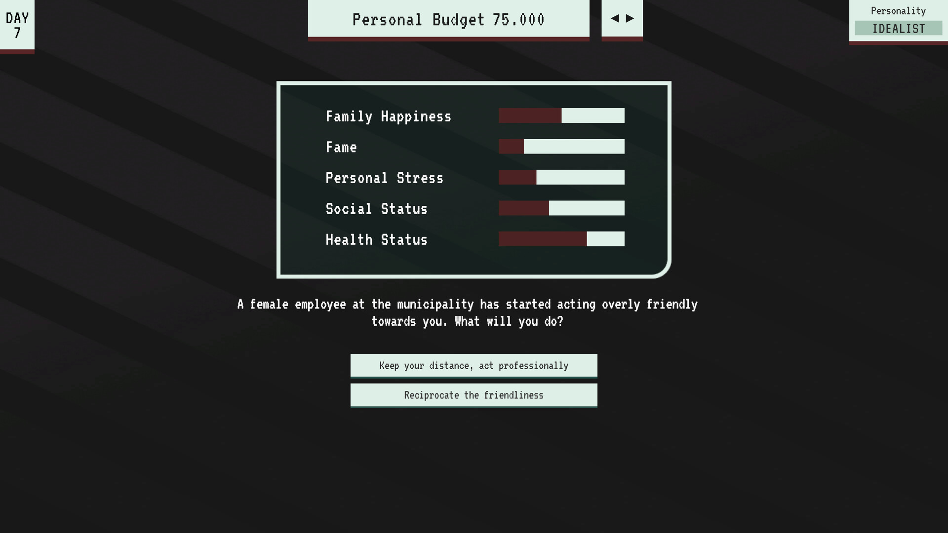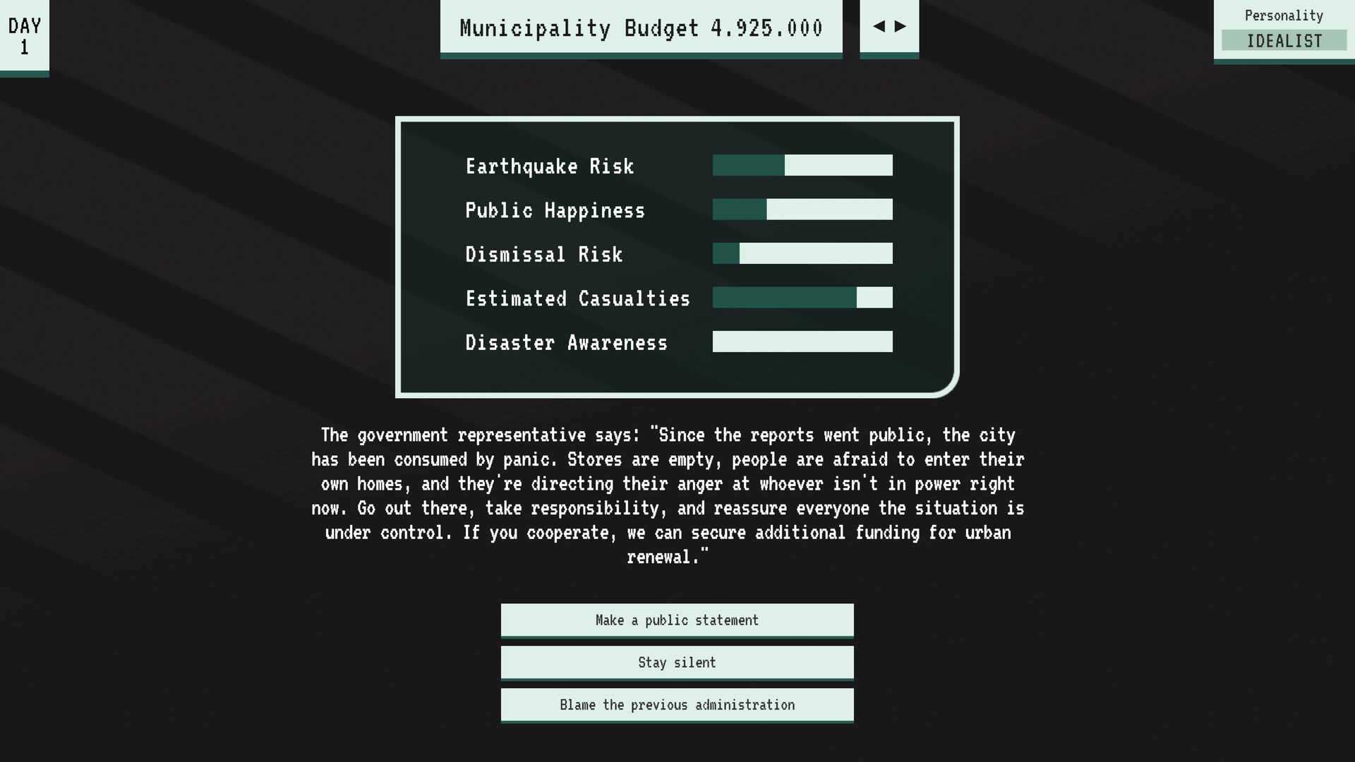 Mayor Quake is a document inspection and decision making game where you play as a mayor preparing a city for an impending earthquake.