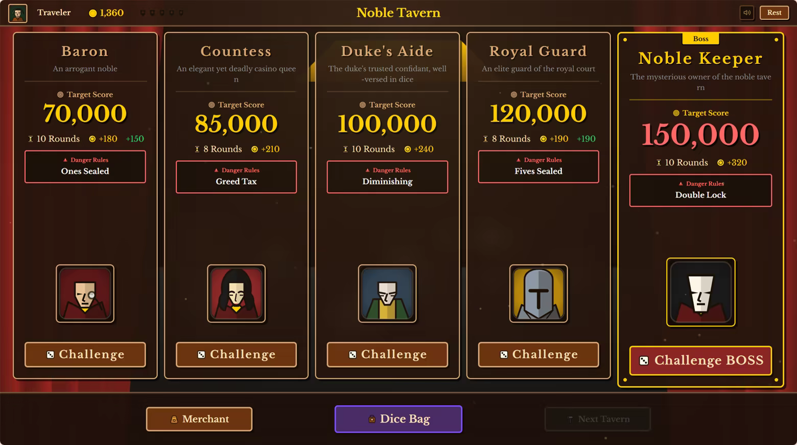 Roll dice. Build synergies. Conquer the throne. Dice Tavern is a Farkle-based roguelike deckbuilder. Collect 23 unique dice, forge 17 set resonances, and outsmart 23 opponents across 6 medieval taverns.