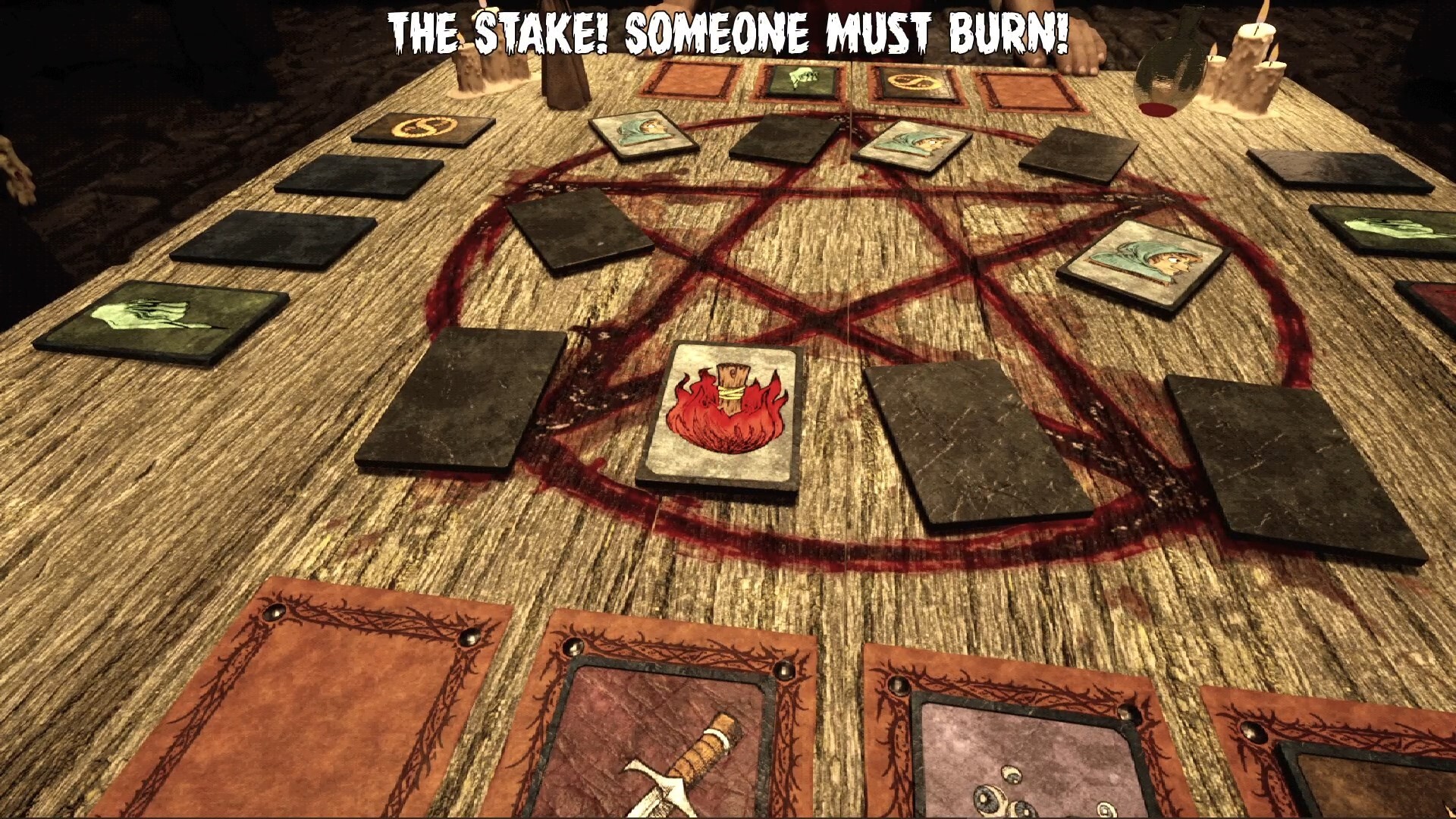 The Witches deal the Verdict Tablets: markers of life, death, and hollow mercy. Memorize their positions before the shuffle. Choose a tablet wisely, nominate a victim, and flip the stone. Pray the judgment strikes your neighbor and not you.