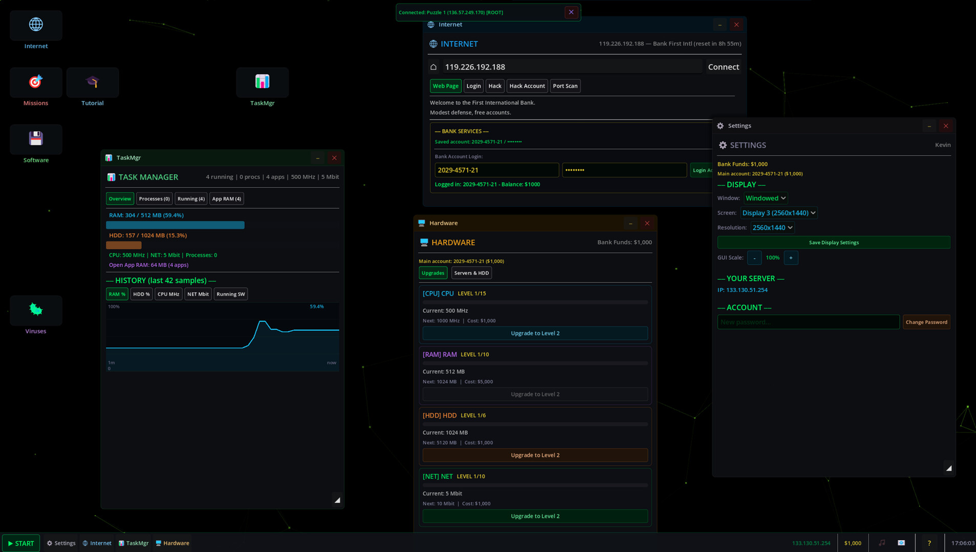 Deploy viruses on compromised servers for passive income. Monitor your botnet through the Virus Manager. Upgrade your CPU, RAM, and network hardware. Mine Bitcoin. Accept contracts from the Mission Board. Climb the rankings.