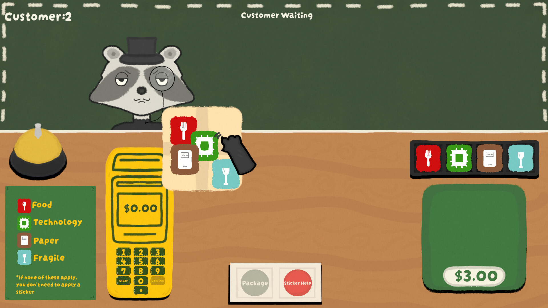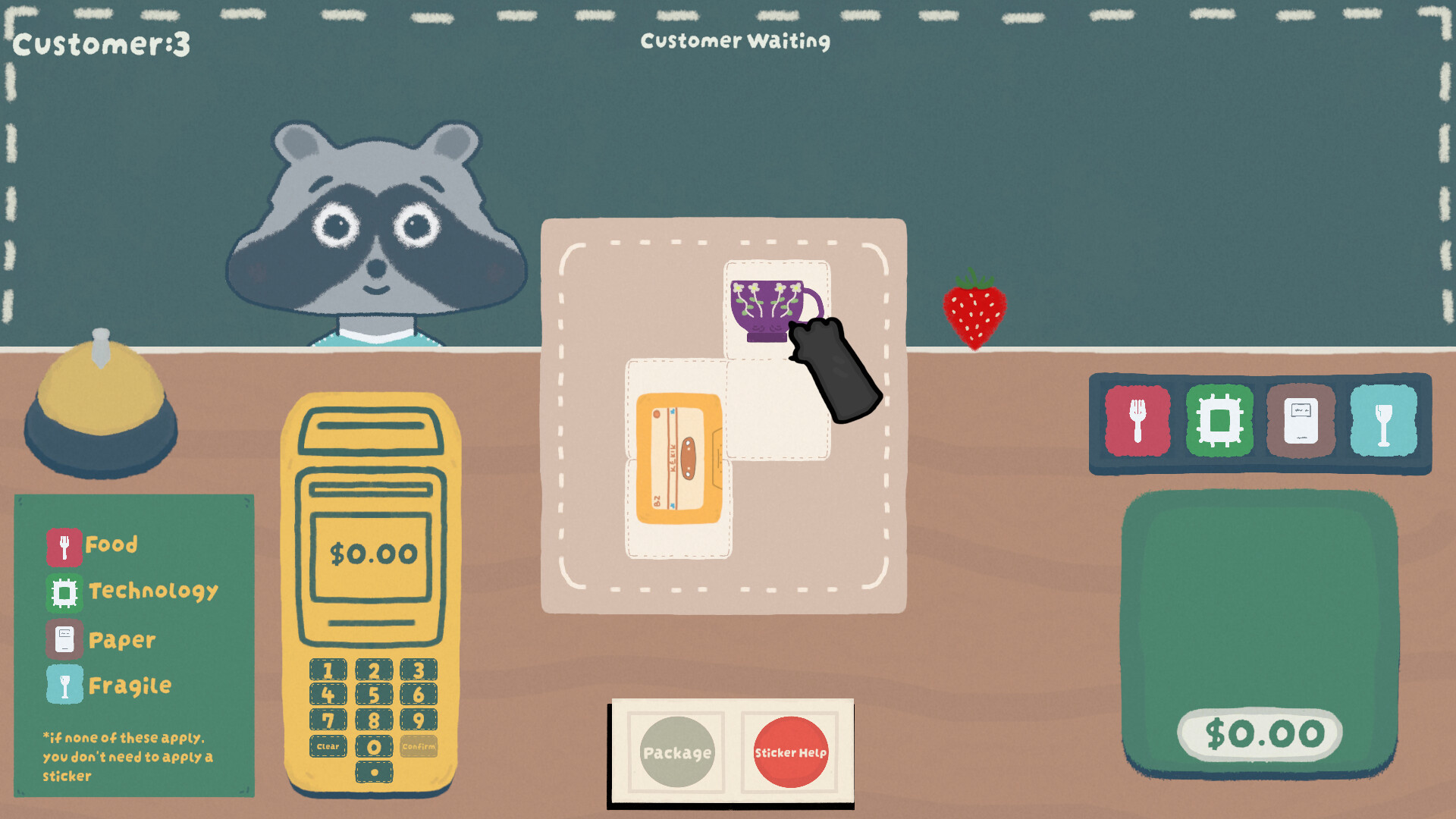 포장이 끝나면 상자를 저울에 올려 배송 비용을 확인하고, 손님에게 전달한 뒤 결제를 완료하세요. 종을 울려 다음 너구리 손님을 맞이하고, 주문이 점점 더 크고 이상하며 복잡해지는 와중에도 흐름을 이어가세요.