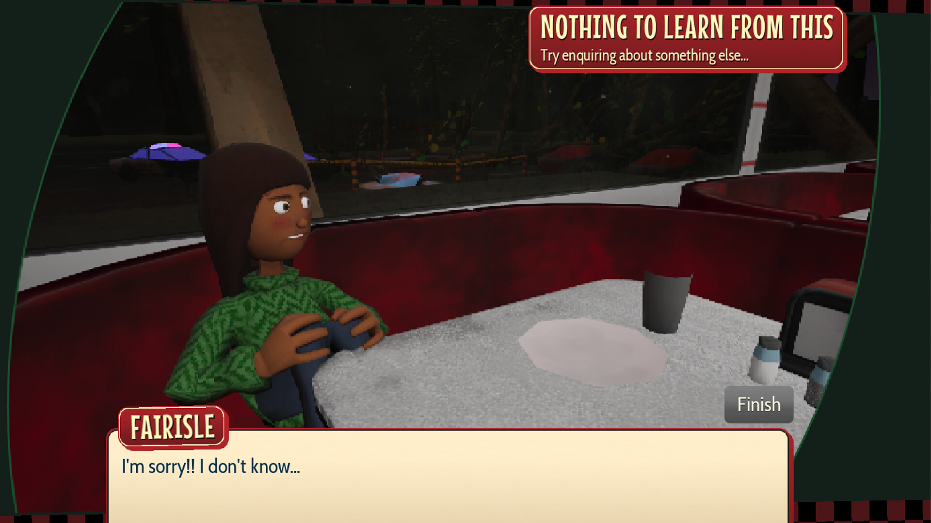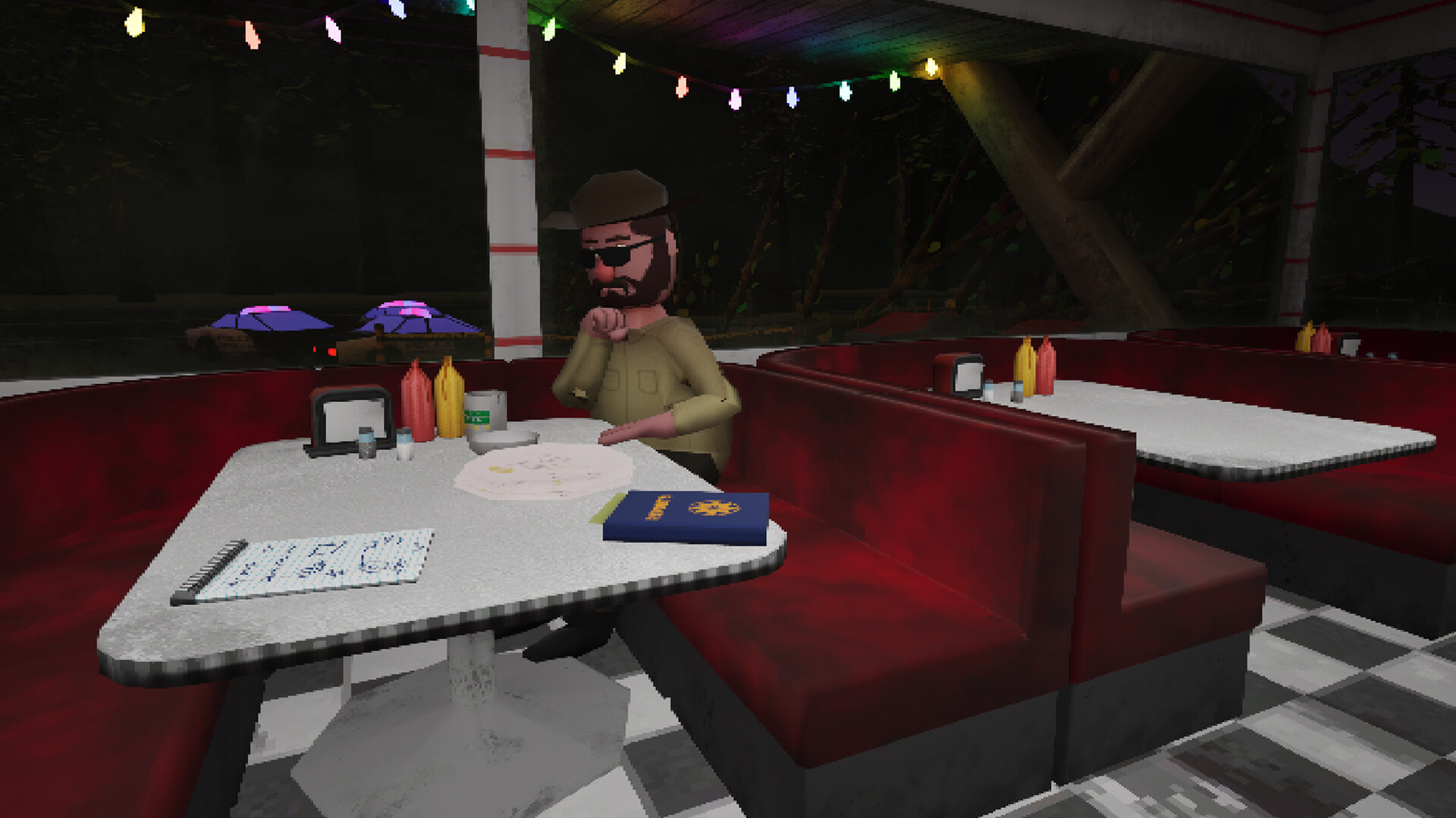 You may be locked in the diner, but that doesn't mean there's nothing to explore. Bother people, investigate things, look under tables. You might find more than chewing gum.