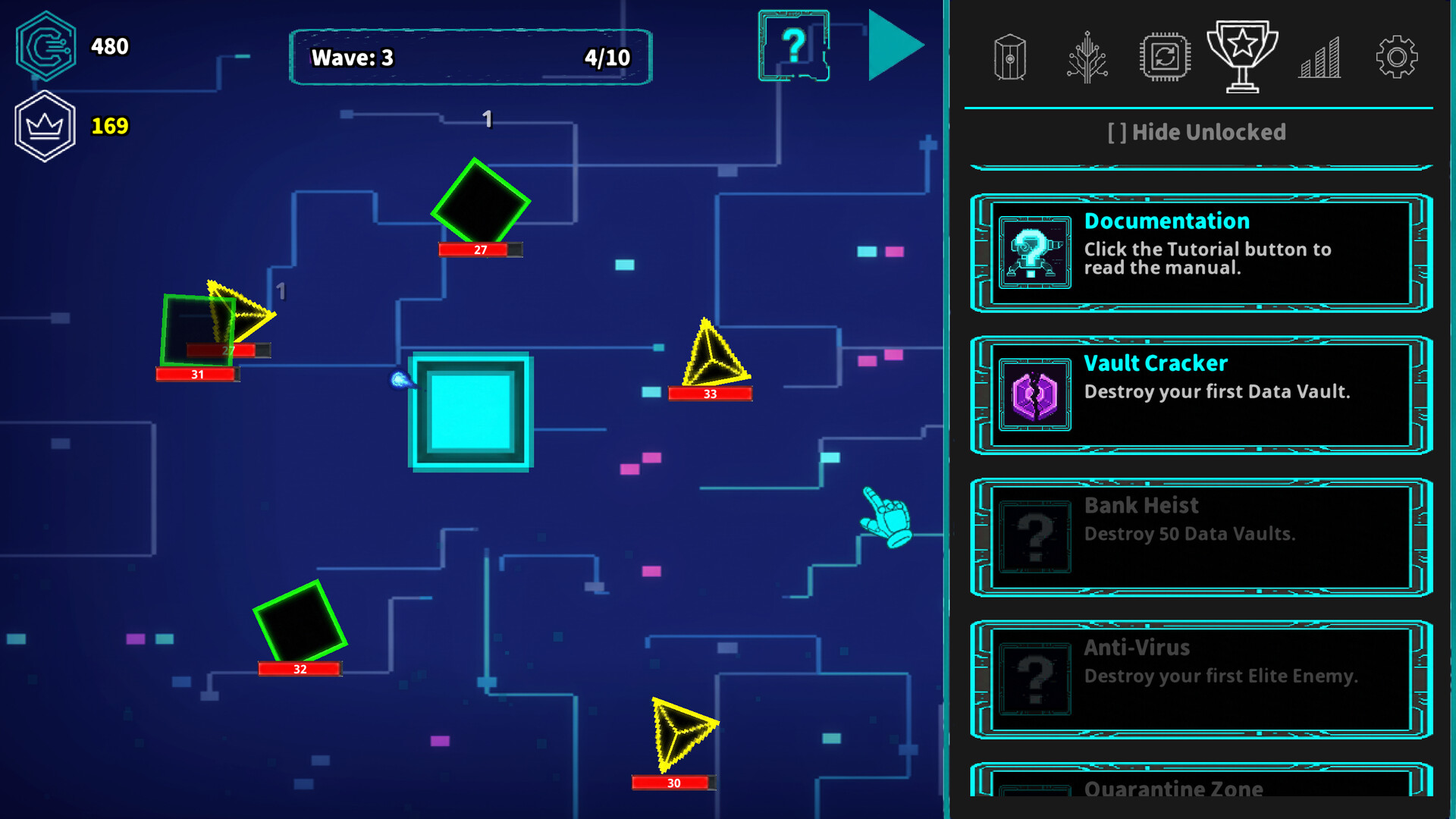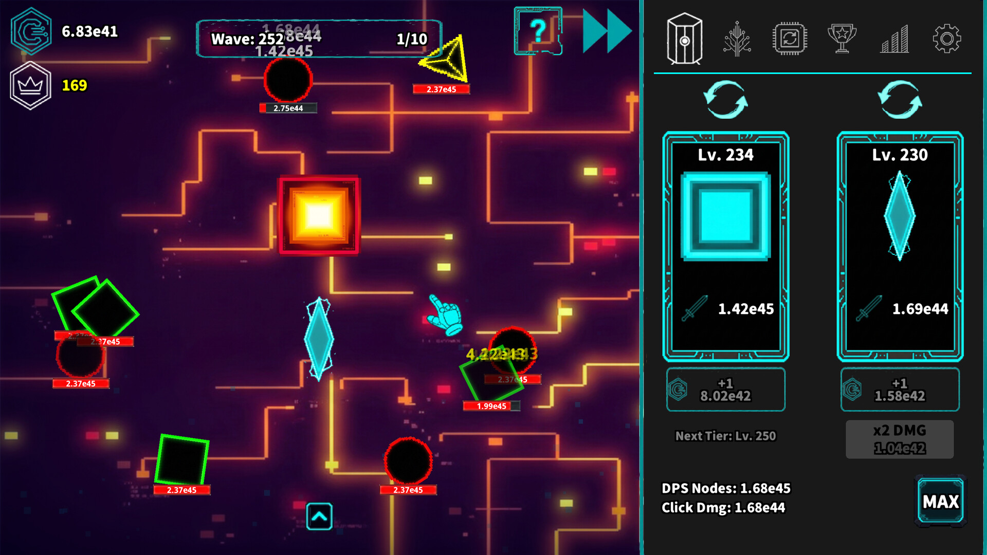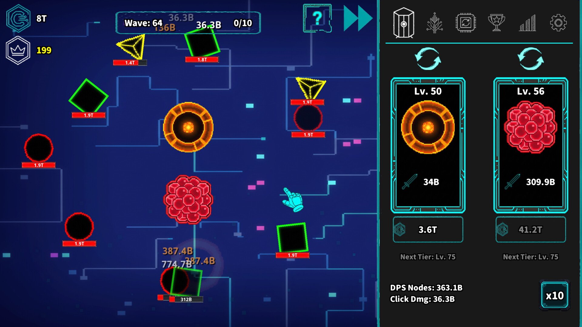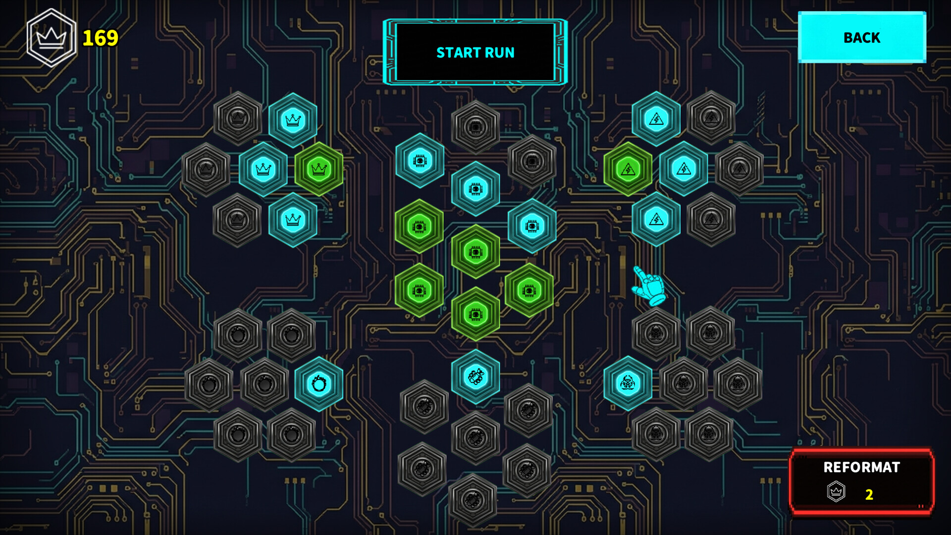 깊이 있는 메타 프로그레션 경제적 한계에 부딪혔나요? 시스템 재부팅(환생)을 수행하여 사이클을 얻으세요. 육각형 그리드 형태의 거대한 스킬 트리인 BIOS에 사이클을 투자하여 "무한 루프" 또는 "초신성"과 같은 궁극기를 잠금 해제하세요. 보스를 물리치면 회로 탭을 위한 업그레이드 포인트(칩)도 얻을 수 있습니다.