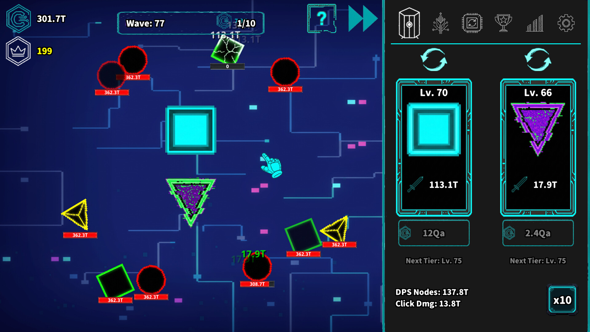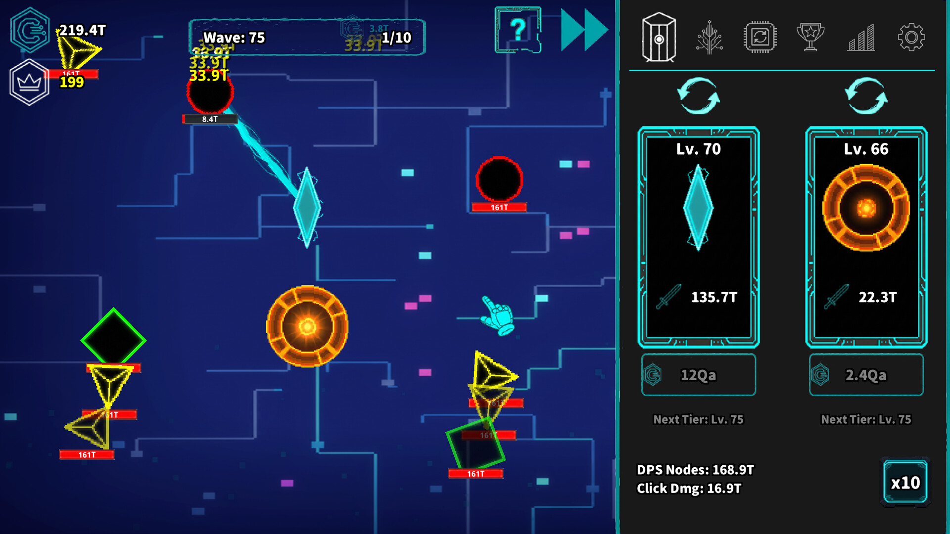 플레이어의 시간 존중: 빠른 템포의 고정 웨이브 생성과 게임을 종료한 상태에서도 정상 수익의 50%를 제공하는 오프라인 진행.