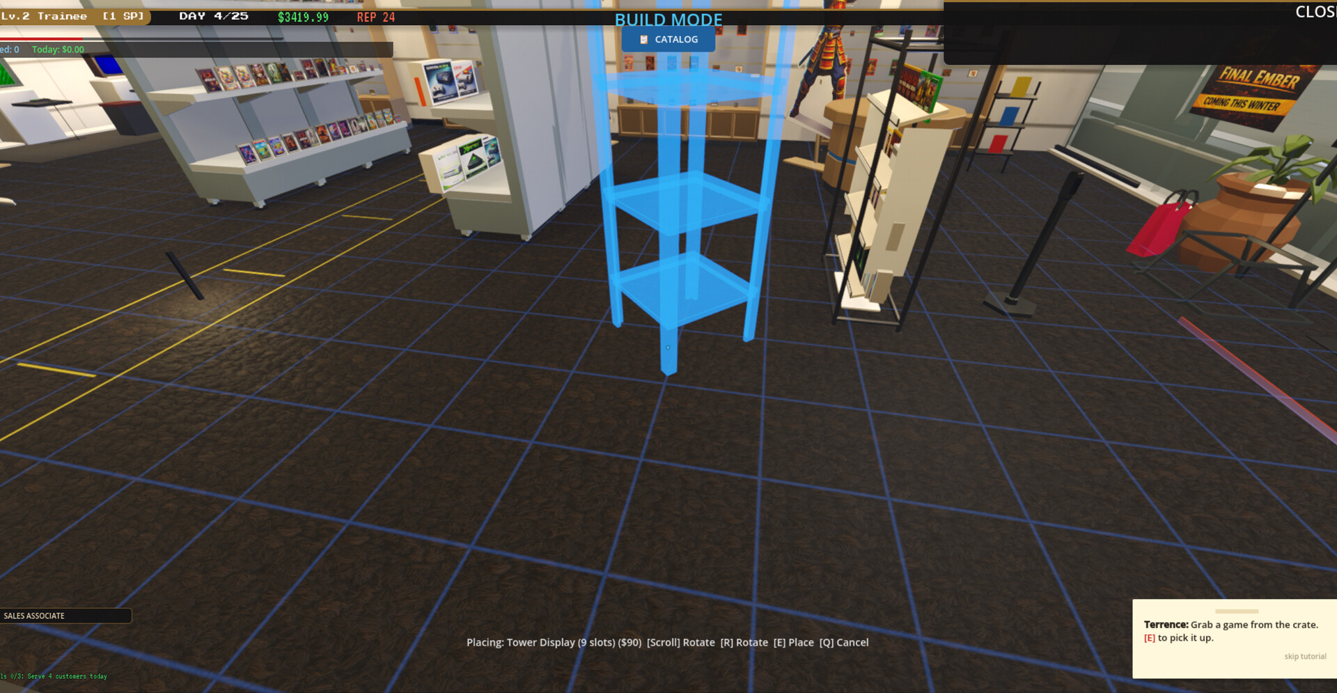 Customize your walls, floors and layout. Place shelves, display cases, demo stations and posters to build the game store of your dreams — then hire staff to help keep it running.