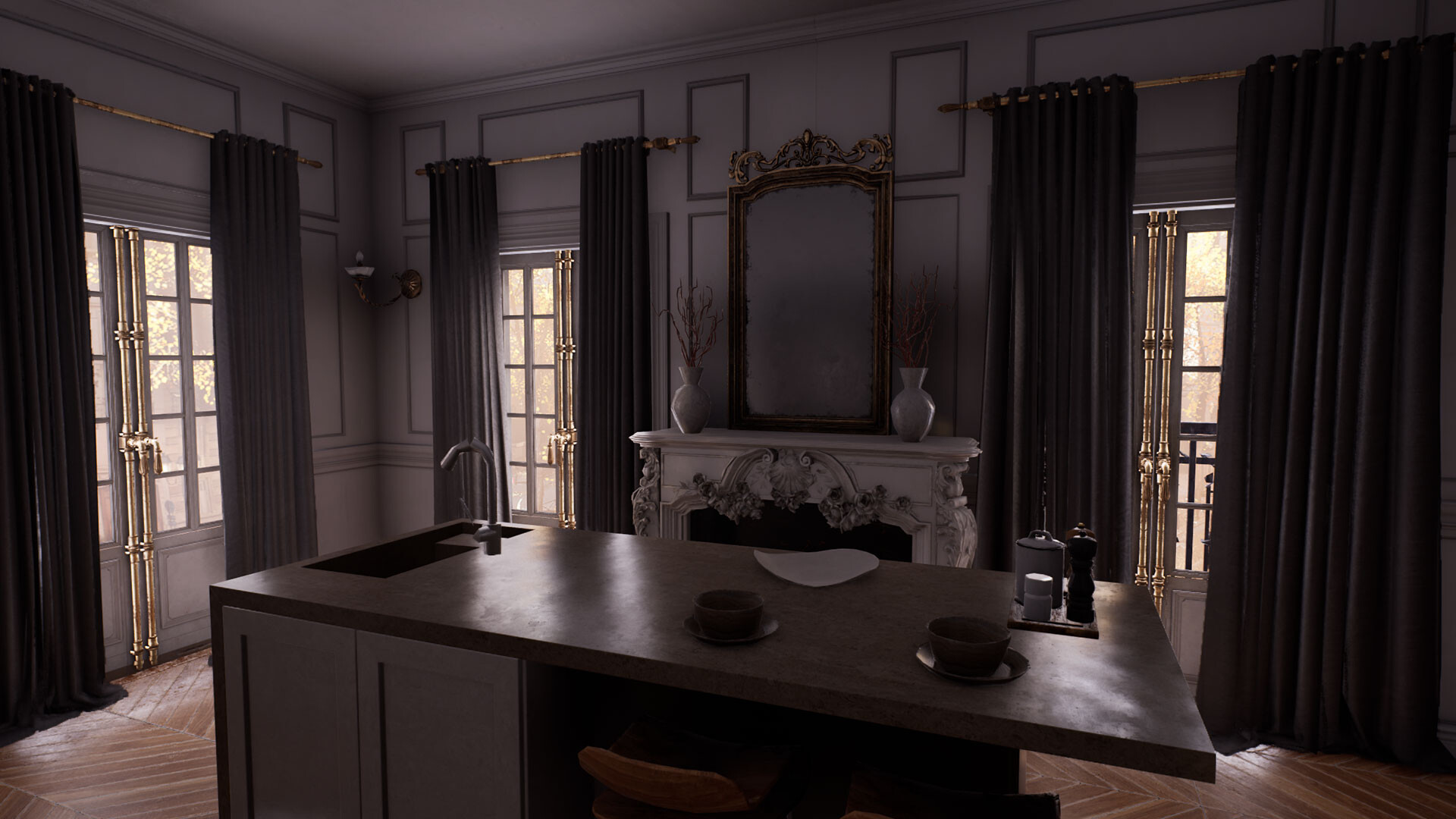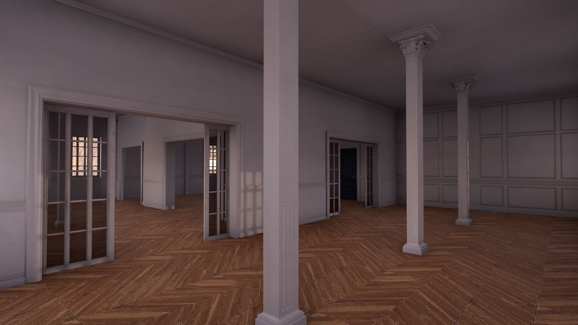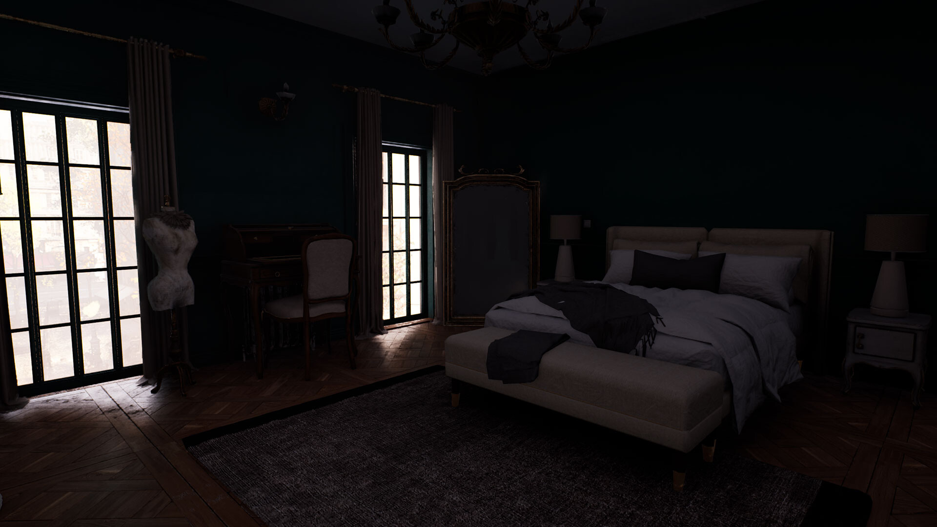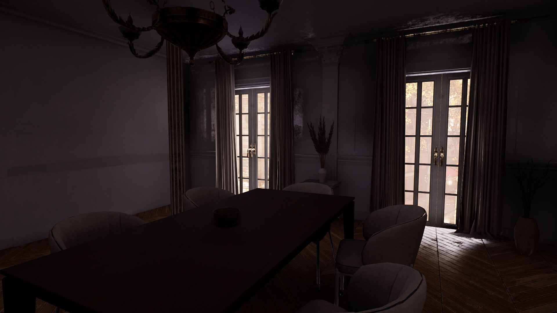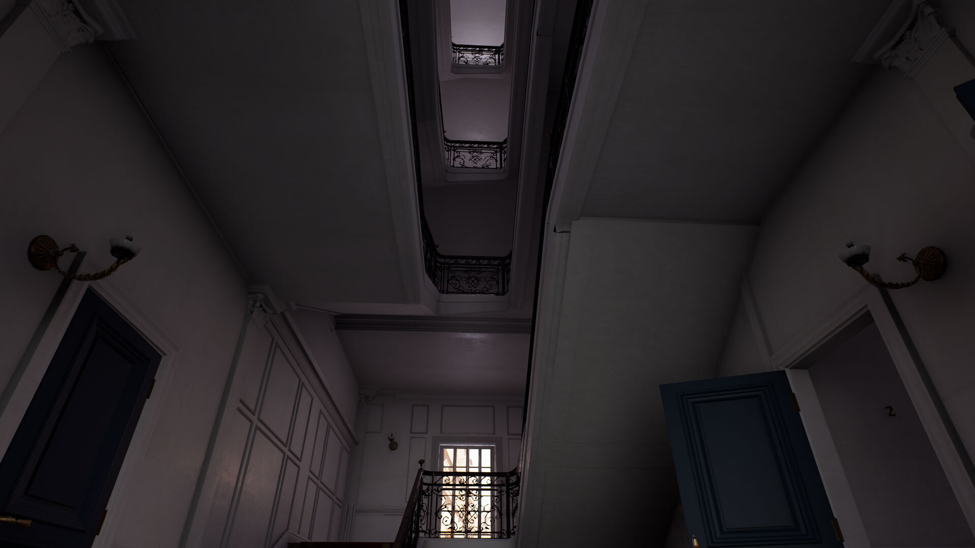 Explore a dark apartment building.