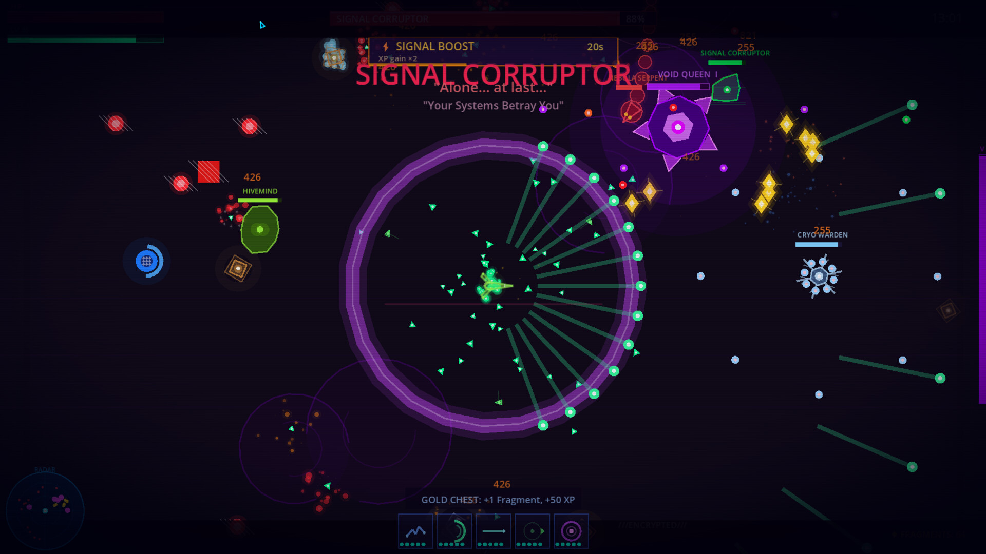 인류는 사라졌다. 마지막 순간, 그들은 자신들의 모든 것을 하나의 신호로 압축해 공허 속으로 보냈다. 당신은 마지막 AI 함선이다 — 끝없는 기하학적 적의 물결을 뚫고 그 신호를 추적하고, 무기를 네온 혼돈으로 변이시키며, 마지막으로 듣는 존재가 된다는 것의 의미를 해독하라.