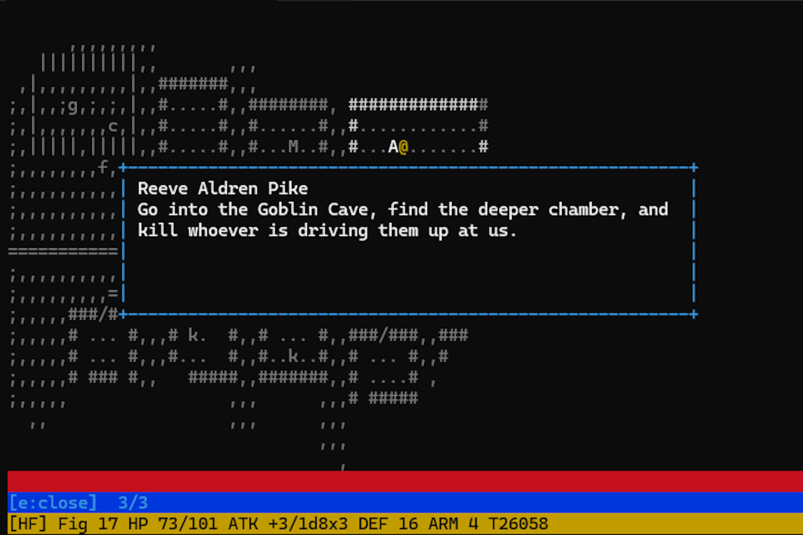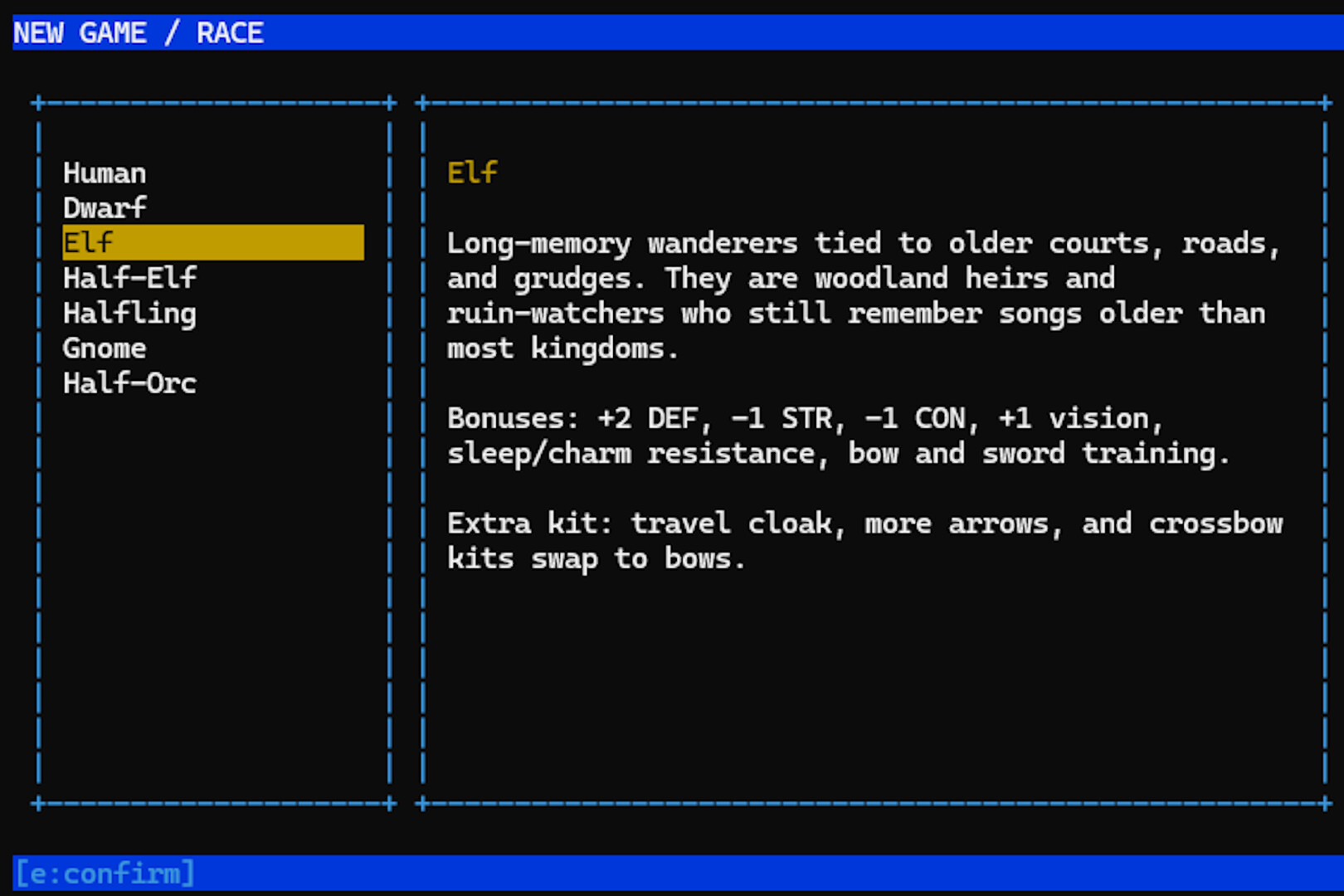 A traditional roguelike with a long and detailed quest line, an expansive world map, and lots of replayability. Choose a race and class, then begin your road toward the Sundering Scar. Good luck.