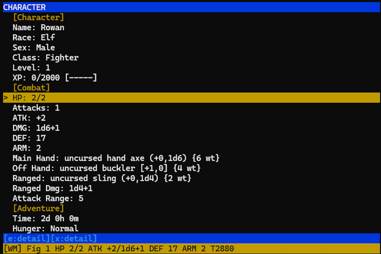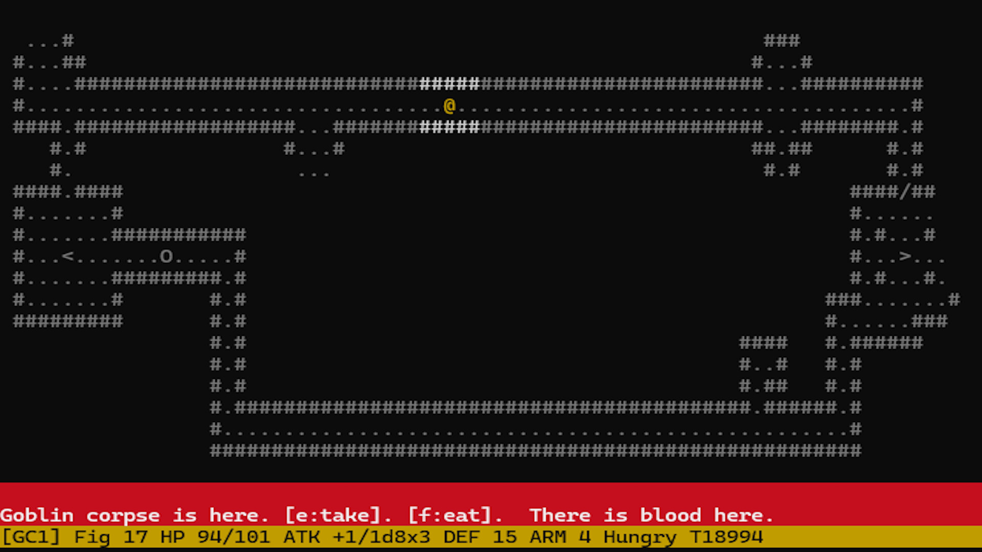 Core roguelike systems: blessed/cursed/uncursed items, hunger, wands, potions, scrolls, eating corpses, 8-way combat, spells.