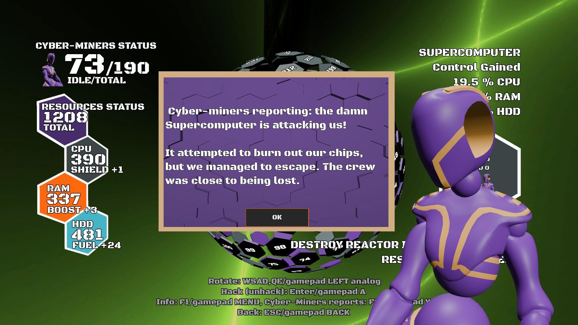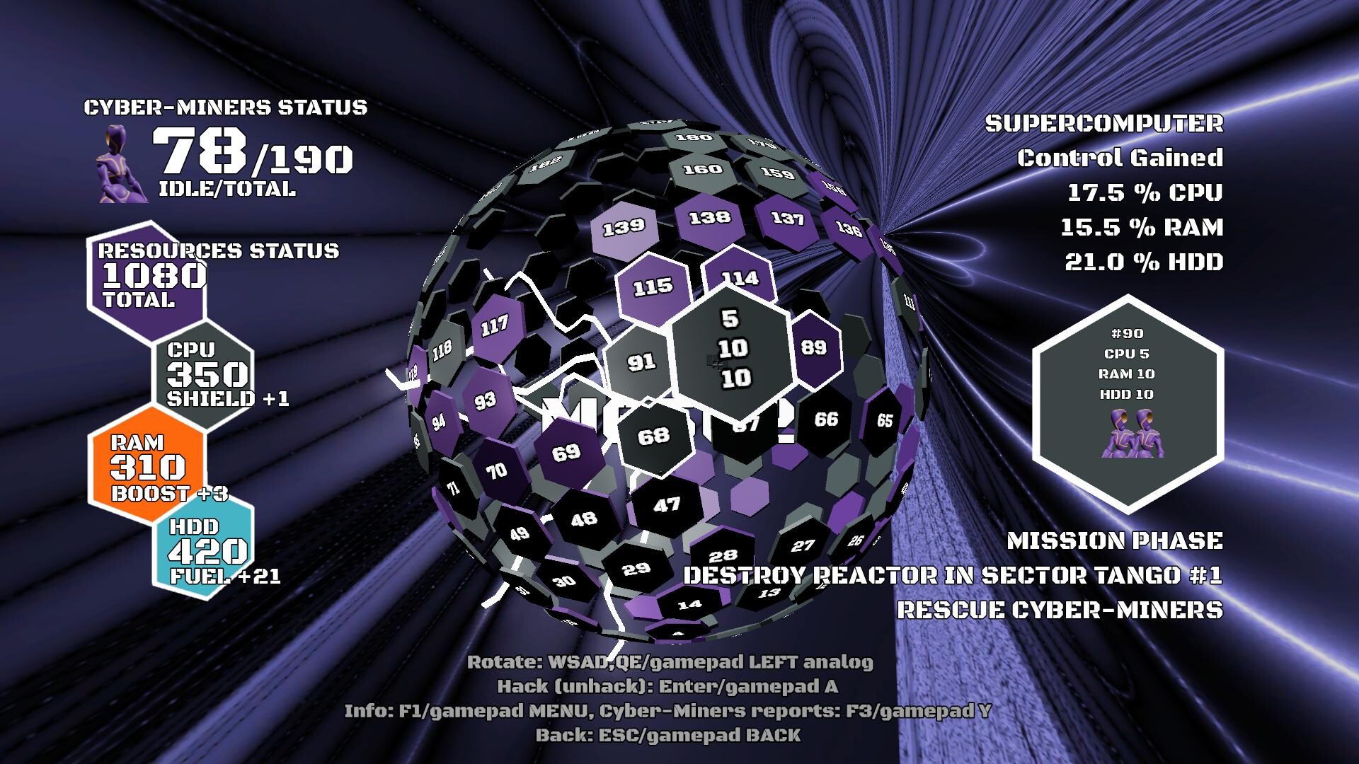 You pilot a rescue helicopter inside a space mining base devastated by explosions. Cyber-miners are stranded, no longer performing their duties - and it’s your job to bring them back. The base was managed by a SUPERCOMPUTER, but it too has malfunctioned. That’s where you come in - manual intervention is now the only option. You recover cyber-miners and harness their processing power to reclaim the Supercomputer’s resources. Step by step, you regain control over CPU, RAM, and HDD.