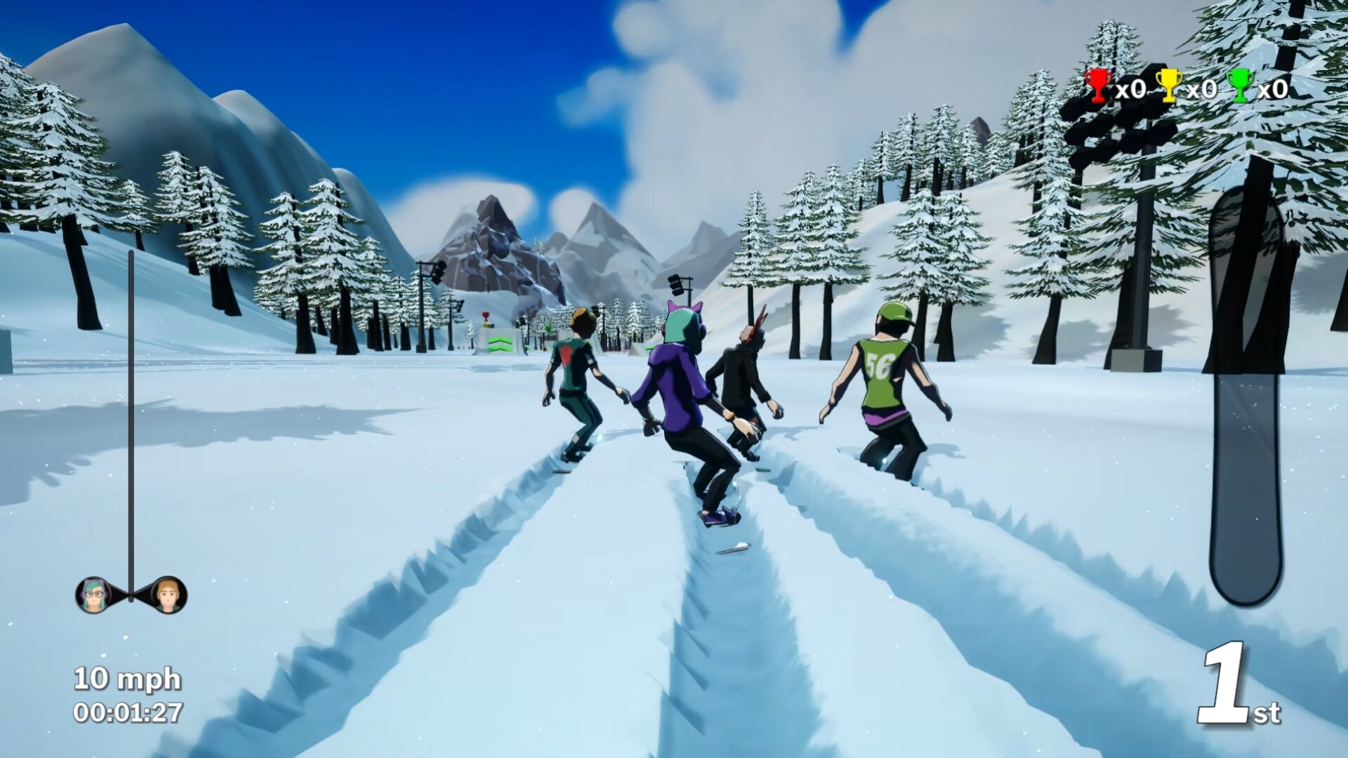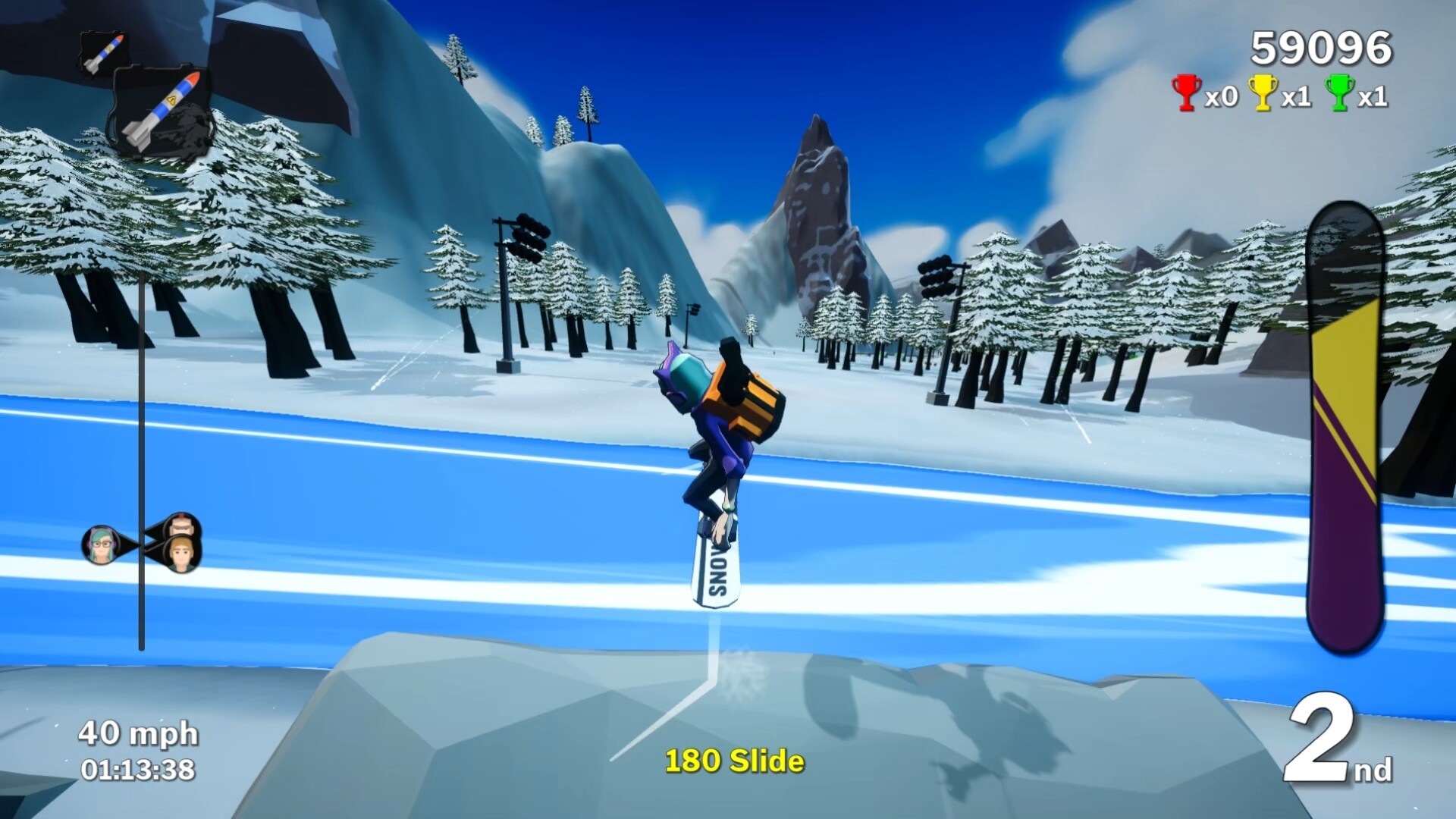 Slopeside Kings는 최대 4인까지 플레이 가능한 멀티플레이어 스노보드 전투 레이싱 게임입니다. 슬로프를 질주하고, 높이 점프하며, 트릭을 성공시켜 부스트를 모으세요. 코스 곳곳에서 혼란스러운 아이템을 획득하고 사용해 전투를 벌이며 결승선을 향해 나아가세요!