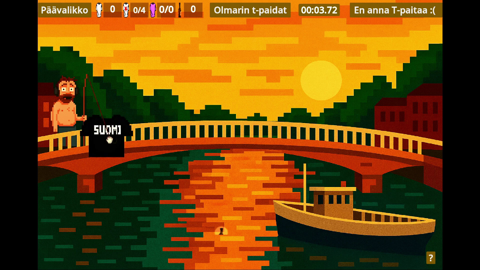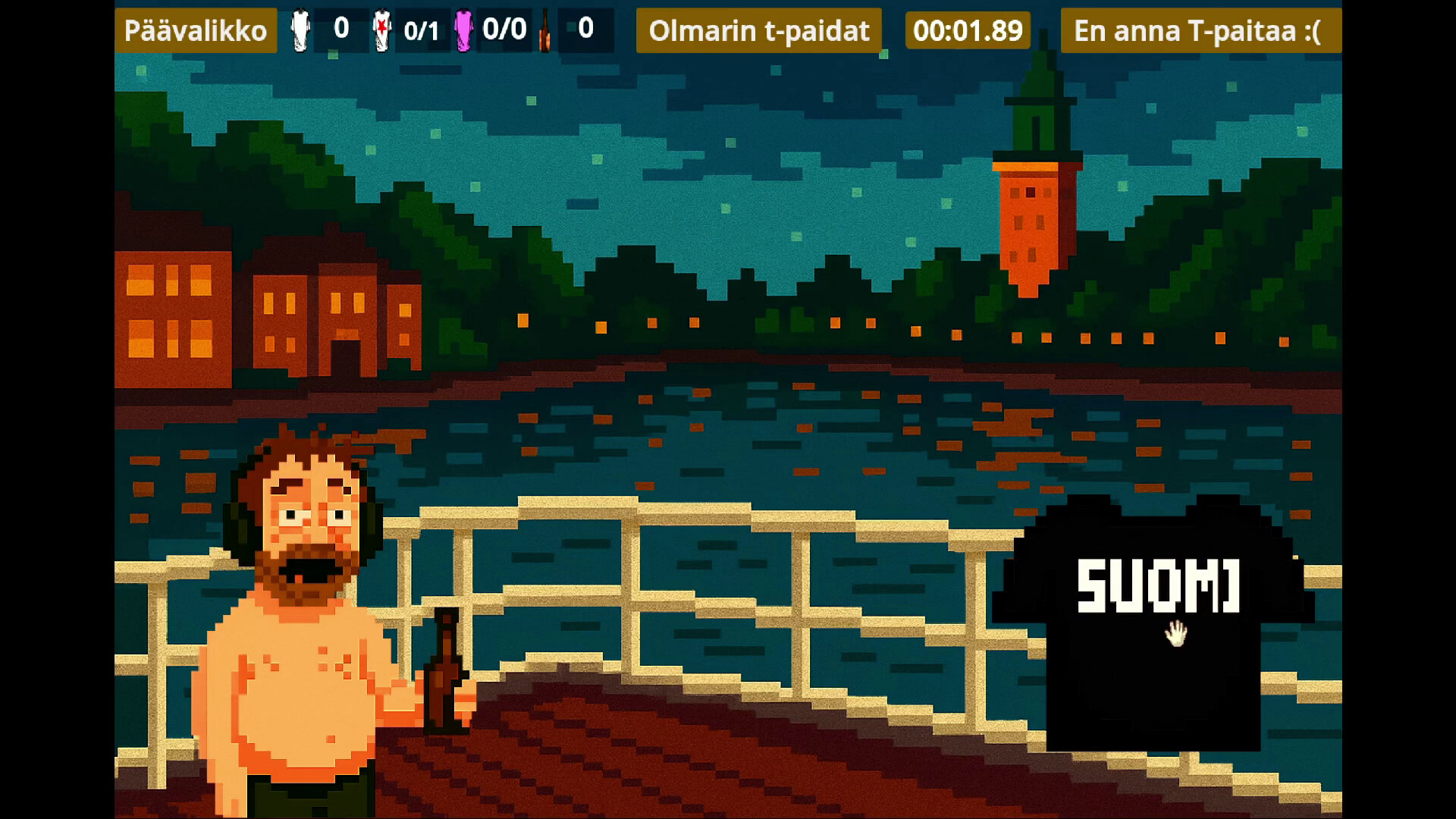 The core mechanic is deceptively simple yet surprisingly engaging: the player uses the mouse to drag a t-shirt onto Olmari’s character. But this isn’t just about dressing up — it’s a taking part of a day in Olmari’s life.