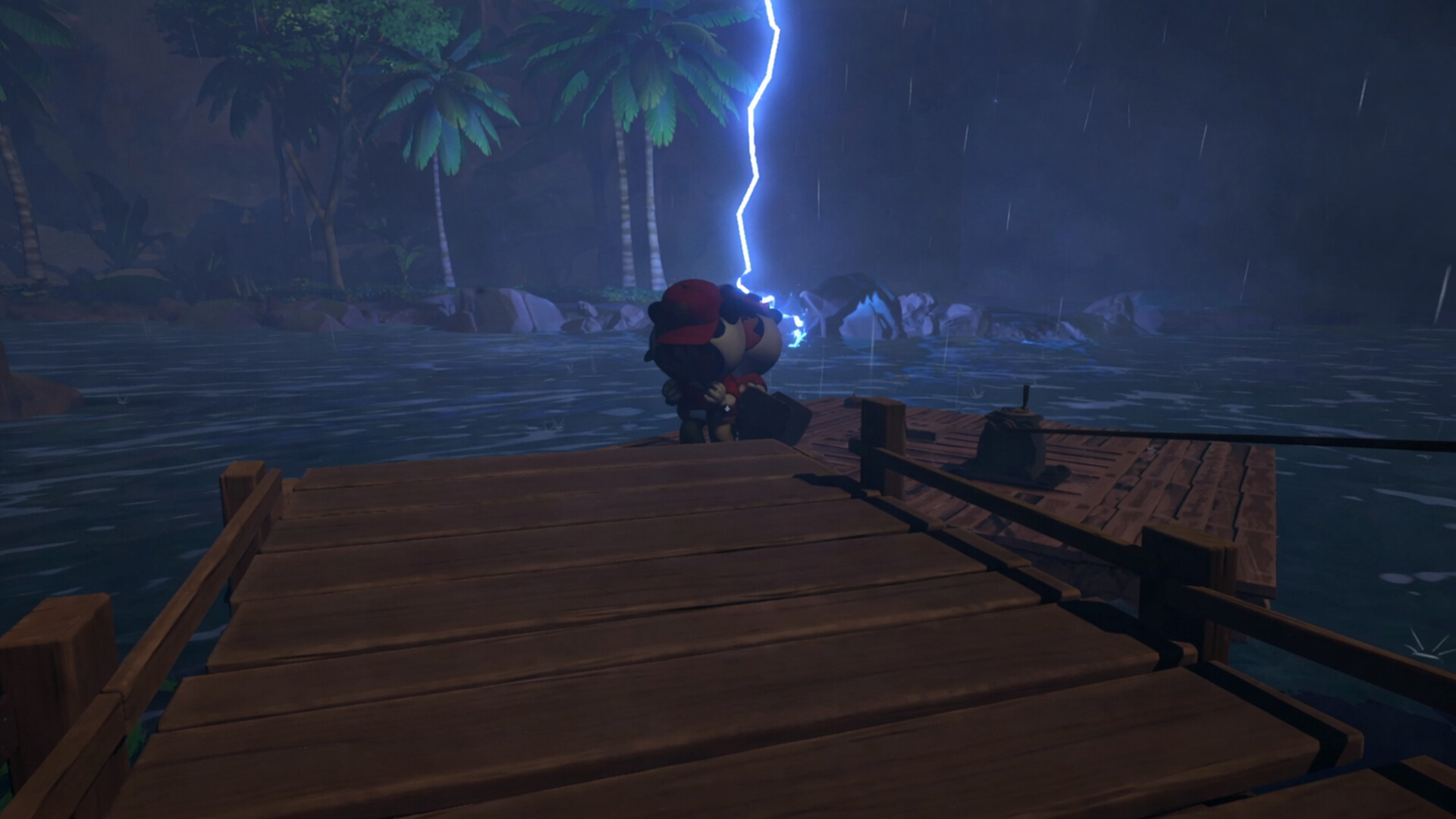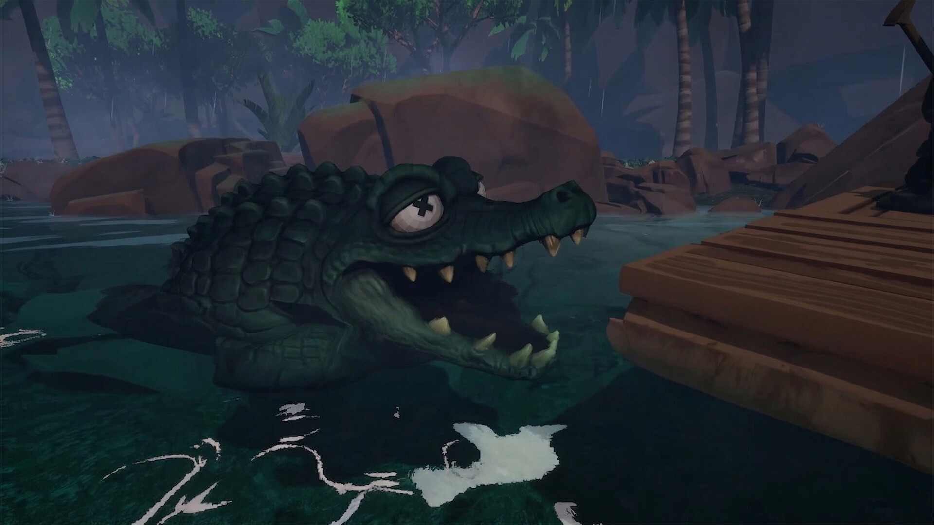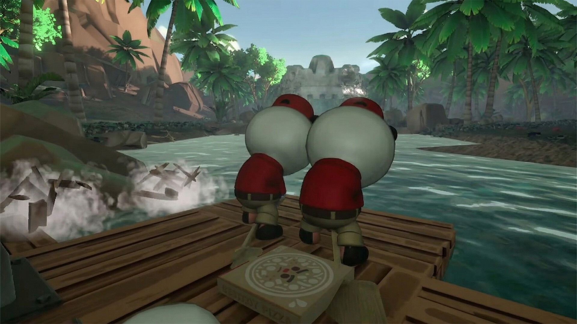 플레이어들은 작은 뗏목 위에서 협력하며 강을 내려갑니다.