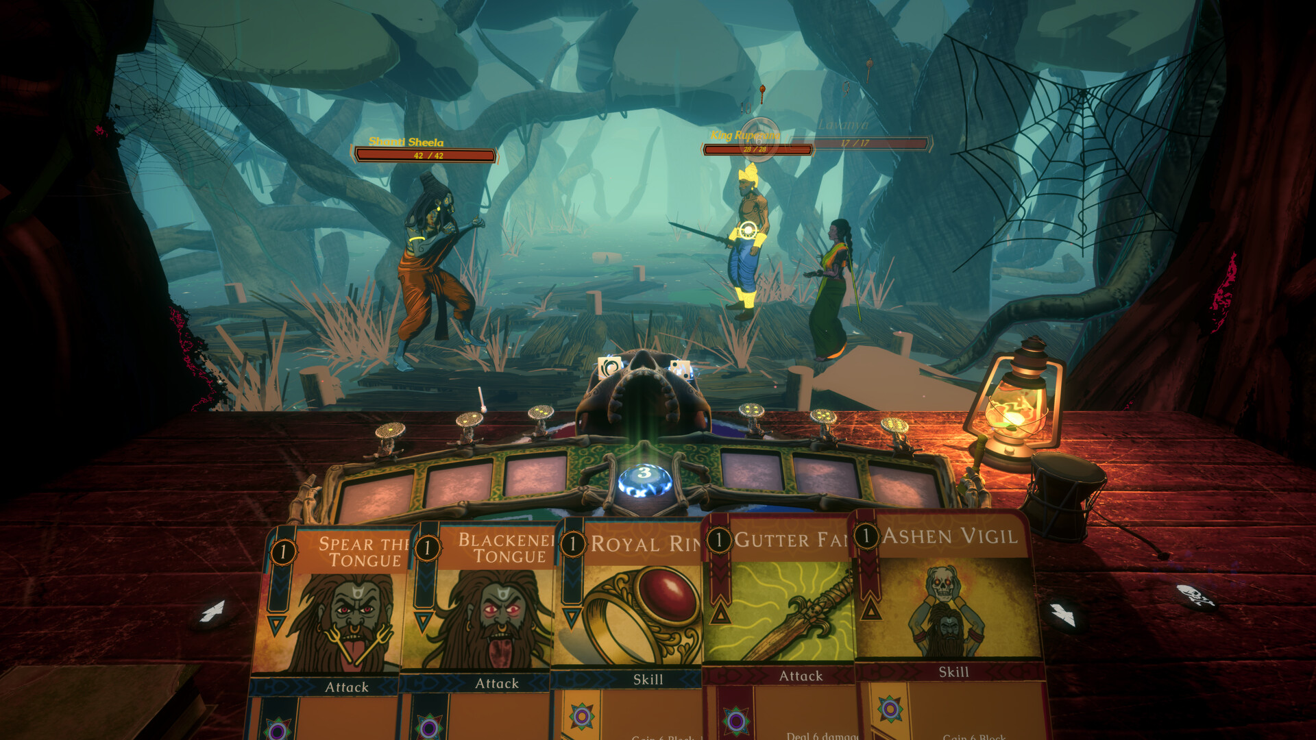 Betaal rides with you as a narrator. He holds information about your character's past that your character doesn't have. Three other figures run through the story. A king whose history overlaps with yours, a celestial observer, and a sorcerer who built the situation you're in.
