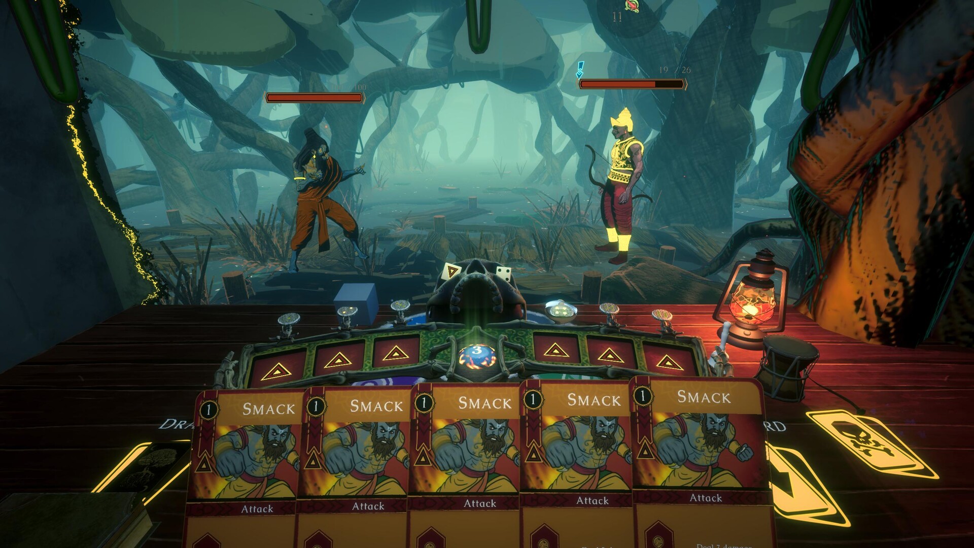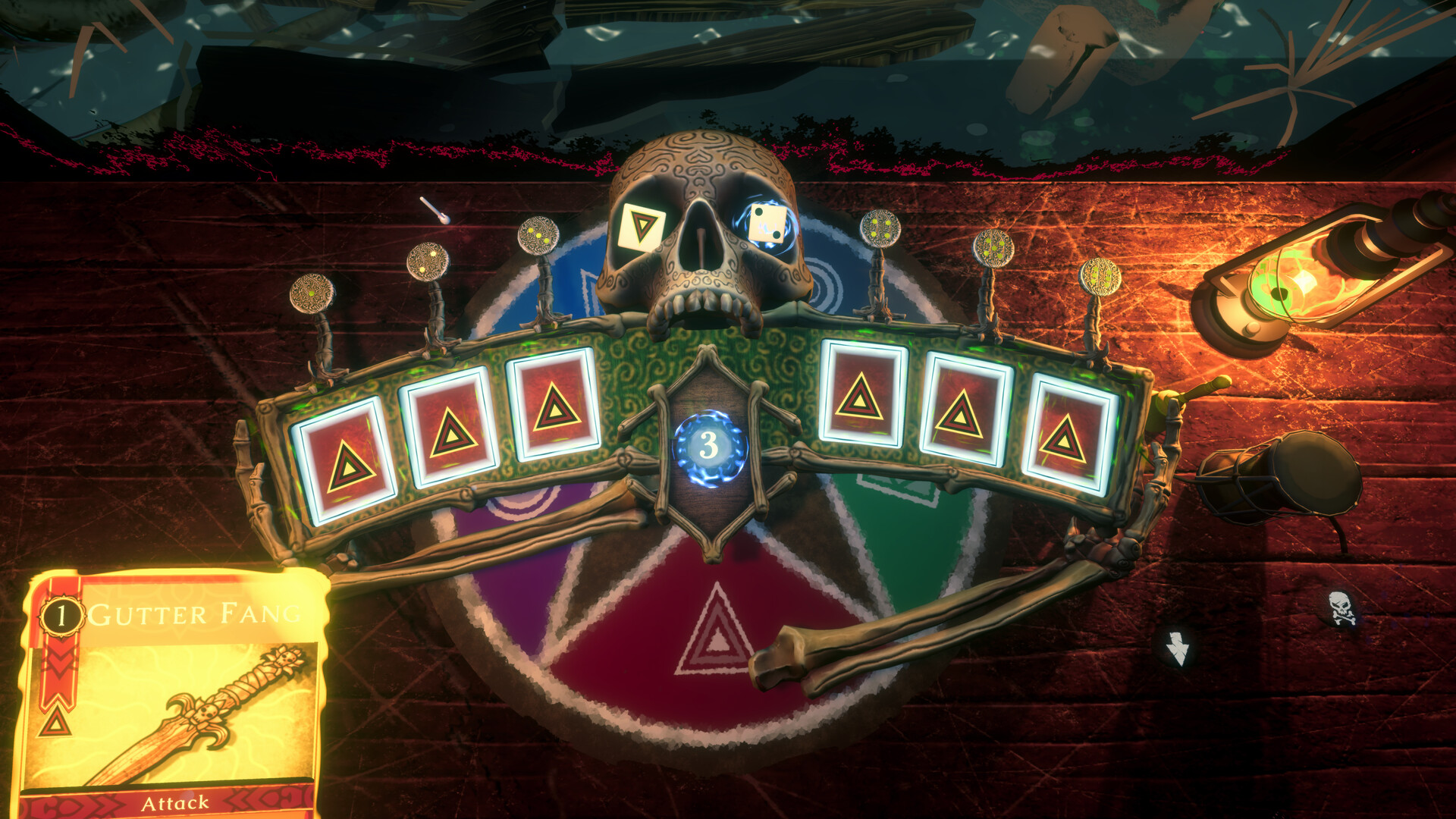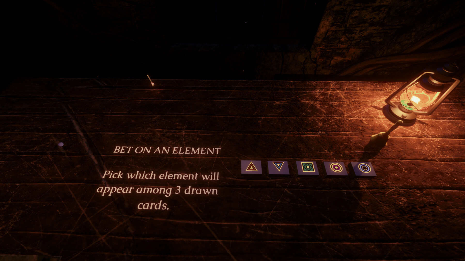 Then the dice. Roll to match symbol or number and trigger effects. Rig a die to lock in one element and guarantee the trigger, but that die is now committed. It won't cover what your next card needs. Every roll is a small resource decision with compounding consequences.