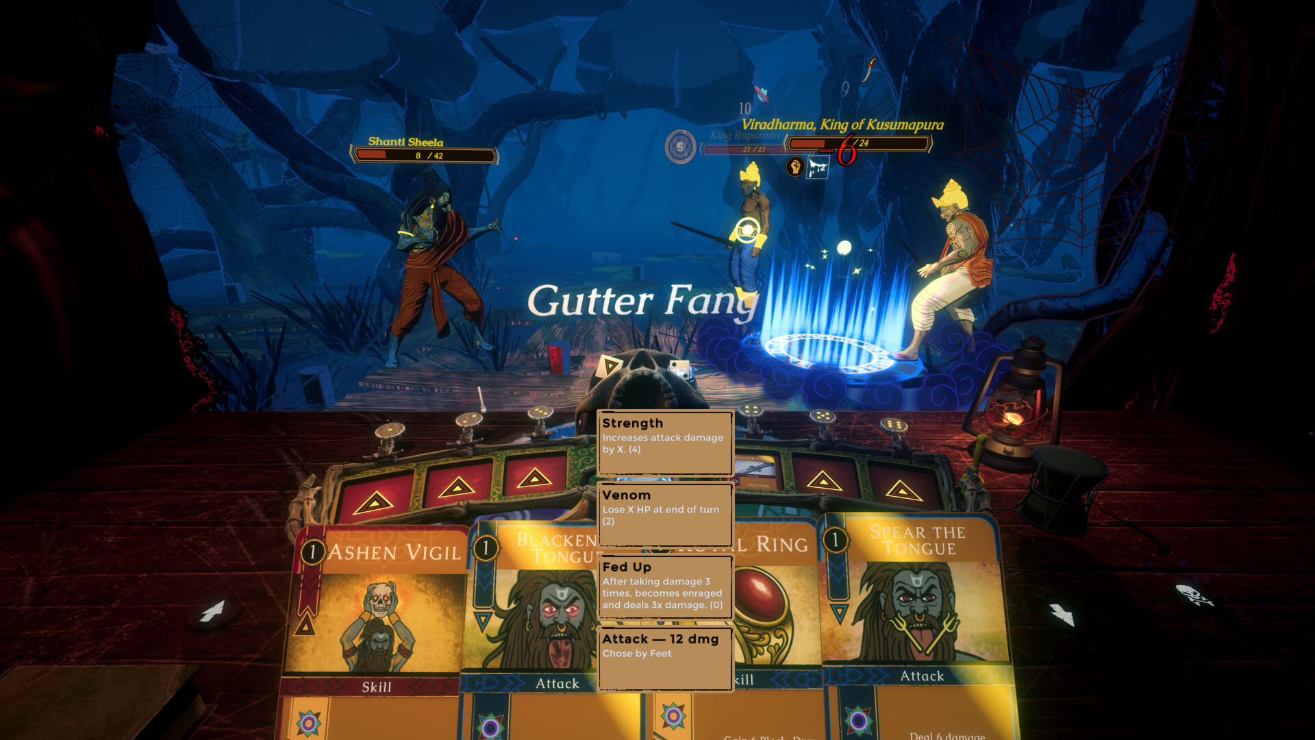 Dosha cards (curses), enter your deck mid-run through encounters. They clog your hand and break synergies. Most element pairs can't remove them. You work around them or you lose to them.