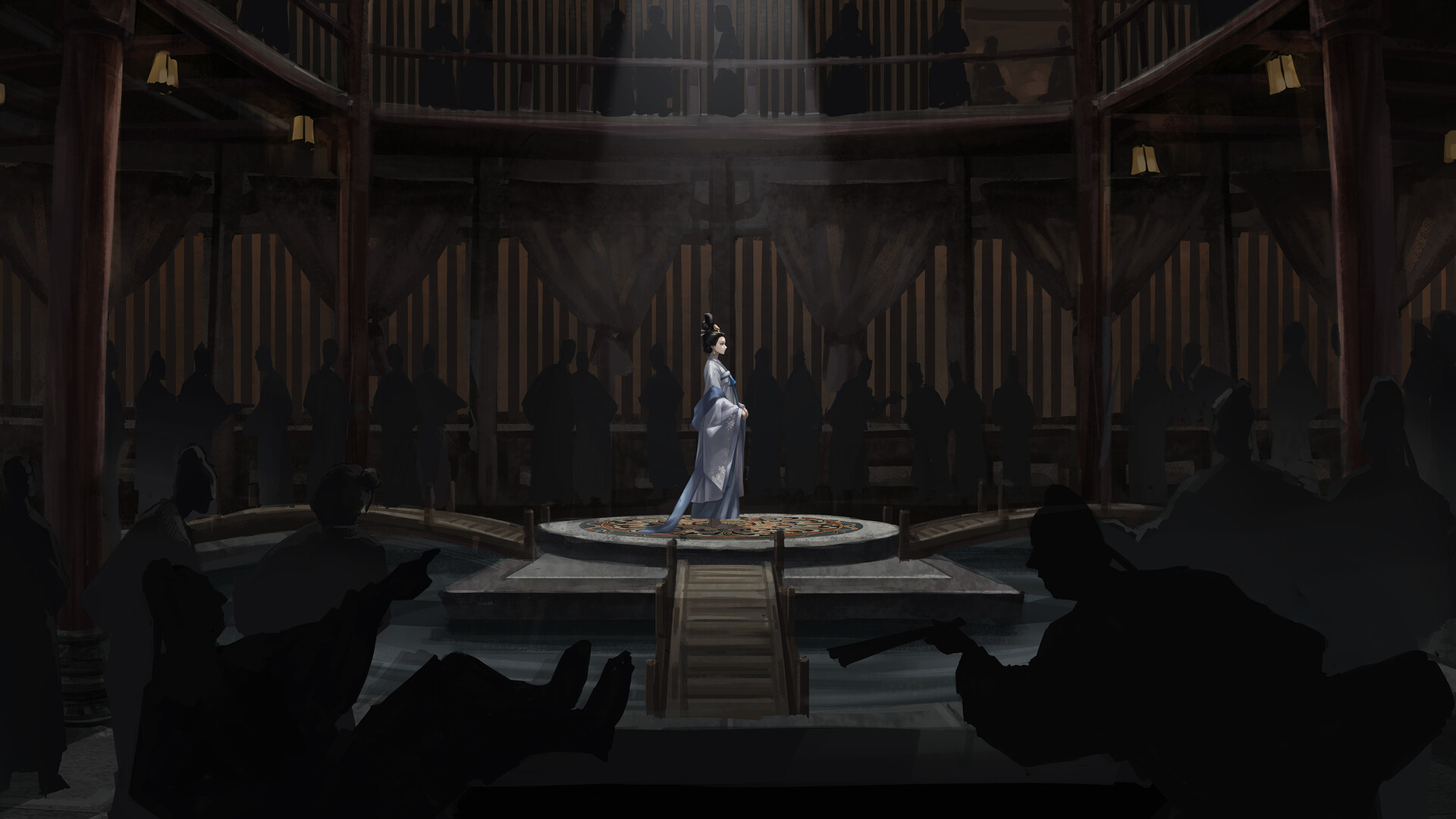 A native of Chang'an, she entered the imperial music bureau in her youth and became one of the capital's most dazzling performers. During the rebellion, she was taken captive and traded from hand to hand as spoils of war. Now sold to a tavern in Liangzhou, she lives on in the shadow of a brilliance the world has already consumed.