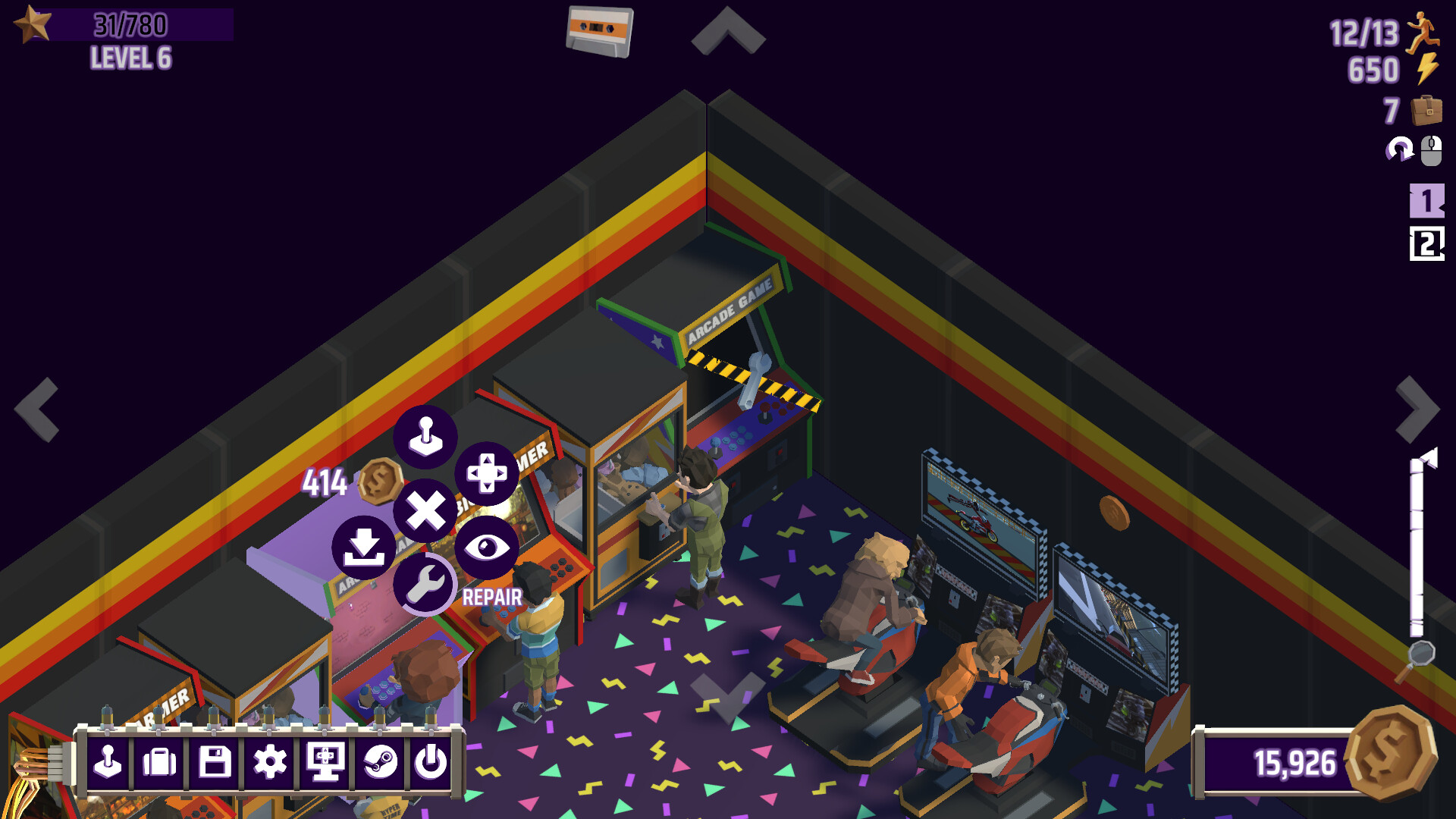 항상 놀고 즐길 수만은 없습니다. 오락실을 계속 운영하려면 할 일이 있어요. 동전 통이 저절로 비워지지는 않으니까요… 적어도 아직은 말이죠. 하지만 오락실을 계속 넓히고 열심히 연구하다 보면, 무언가 새로운 것을 풀게 될지도 몰라요…