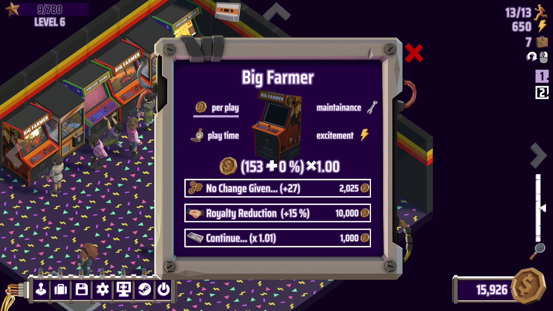 가끔은 편안히 쉬면서 오락실의 신나는 분위기에 푹 빠져보는 것도 잊지 마세요. 직접 만든 오락실이니, 사람들이 즐거워하는 모습을 지켜보는 것도 좋잖아요! 그리고 왜 오락실을 하나만 운영하나요? 이 게임은 멀티태스킹을 즐기는 분들을 위해 만들어졌답니다. "하나도 좋다면, 더 많으면 더 좋겠죠!", 그쵸…
