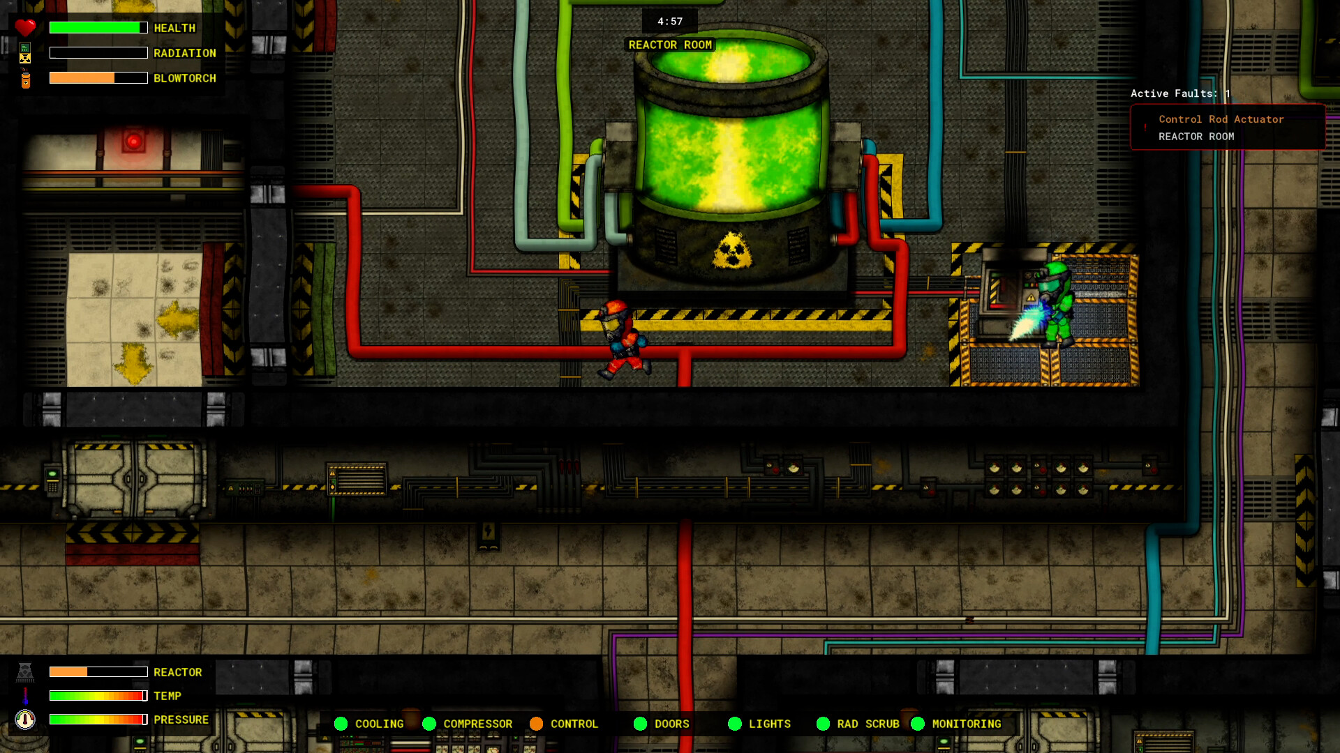 A pipe bursts in the cooling room. Now temperature is climbing. The reactor starts taking damage. Then the lights go out. Then the doors stop working. Sometimes your alert system might not even tell you what's wrong. PS: there's radiation in the hallway now. Good luck.