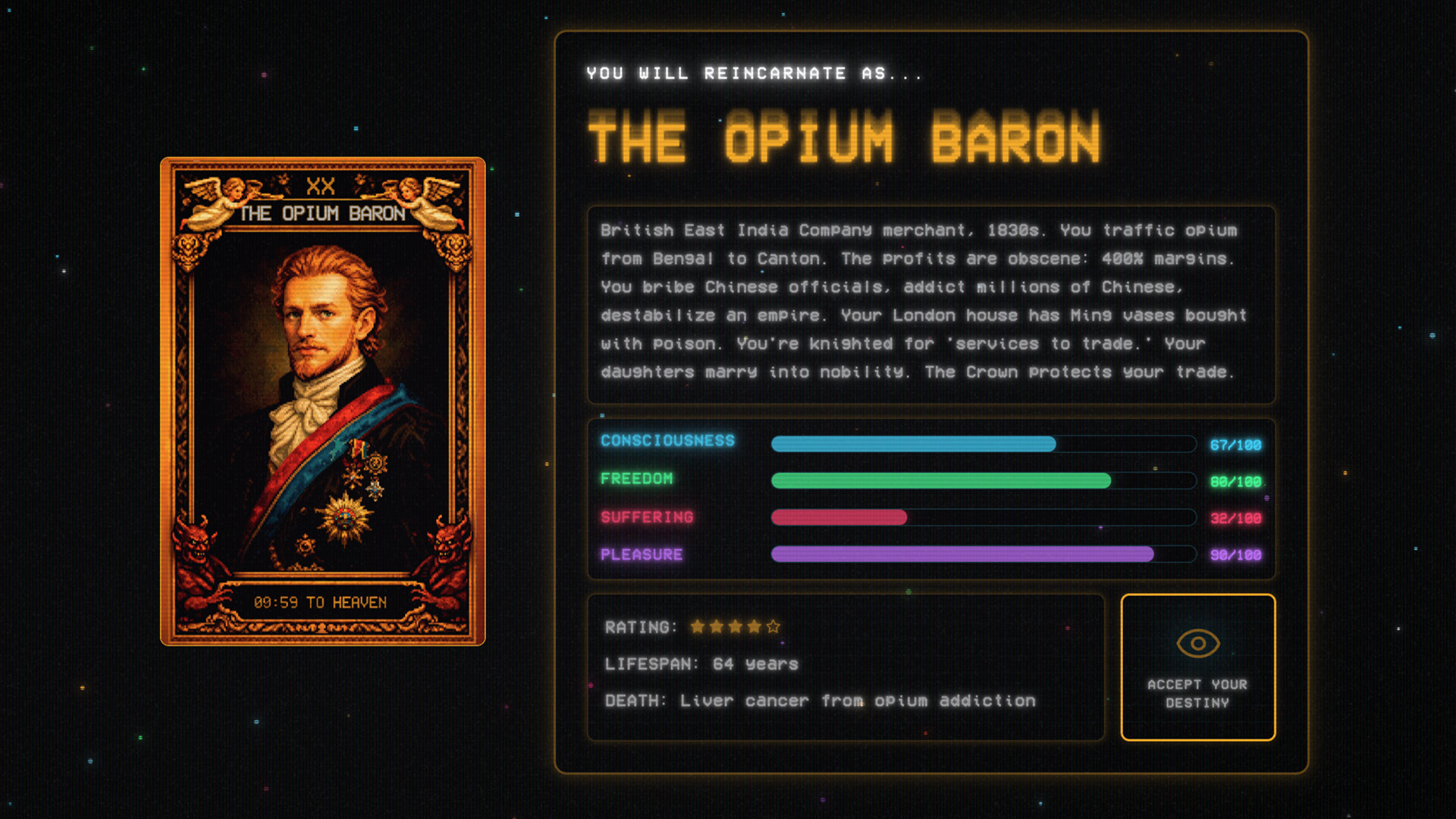 Dozens of unique ending cards leading to Heaven, Hell, or Reincarnation