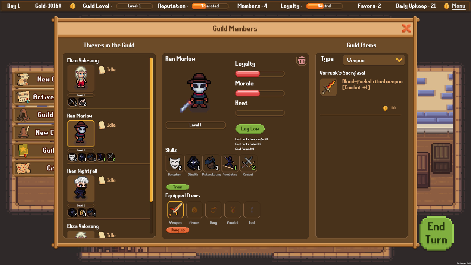Expand your guild and recruit from various thieves each with unique skill affinities. Train their abilities, equip them with magic items, and manage their loyalty, morale, and heat levels.