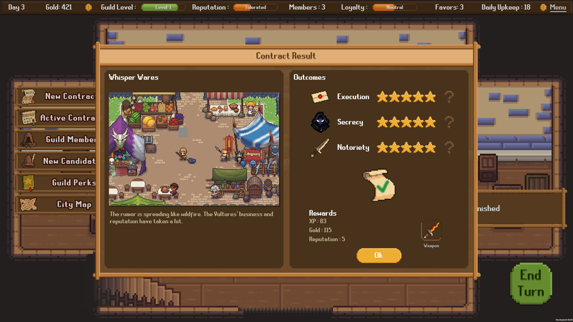 Contracts are rated on Execution, Secrecy, and Reputation. Send too many thieves and you'll be noticed. Send too few and they won't come back.