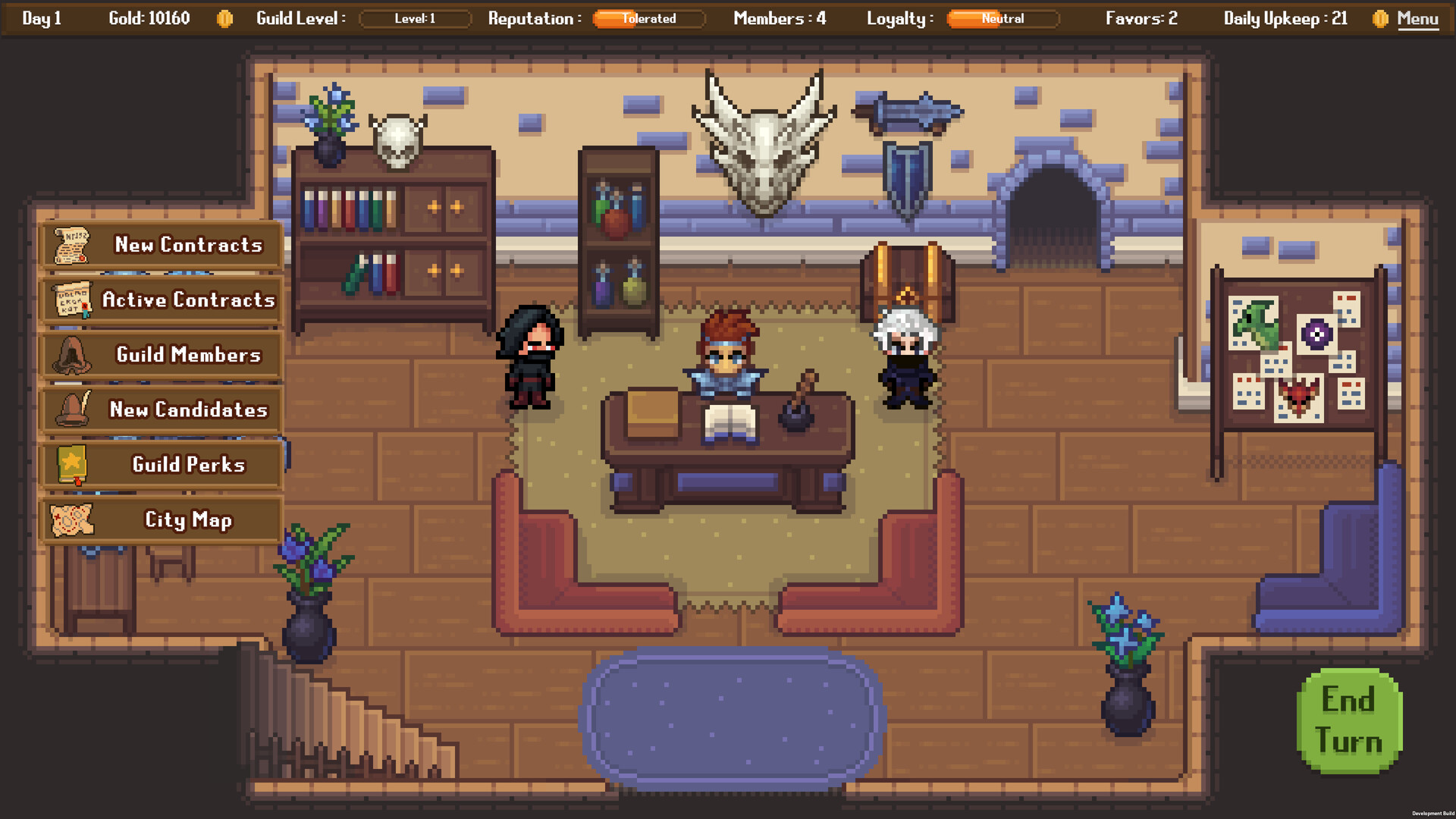 Discover and recruit key NPCs by earning their respect and loyalty. From a master forger who communicates only through dead drops, to a retired pit fighter running an underground arena and a temple priestess with secrets of her own. Some of them will become your advisors, strengthening the guild’s foundations, while some of them will unlock new guild rooms that provide certain benefits.