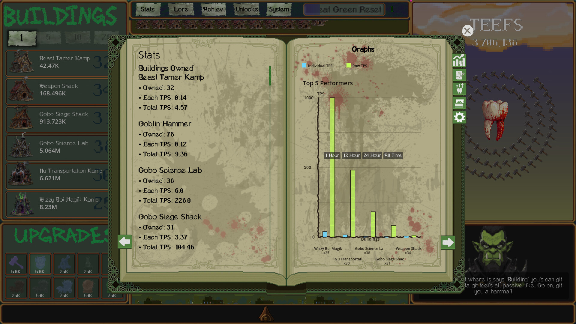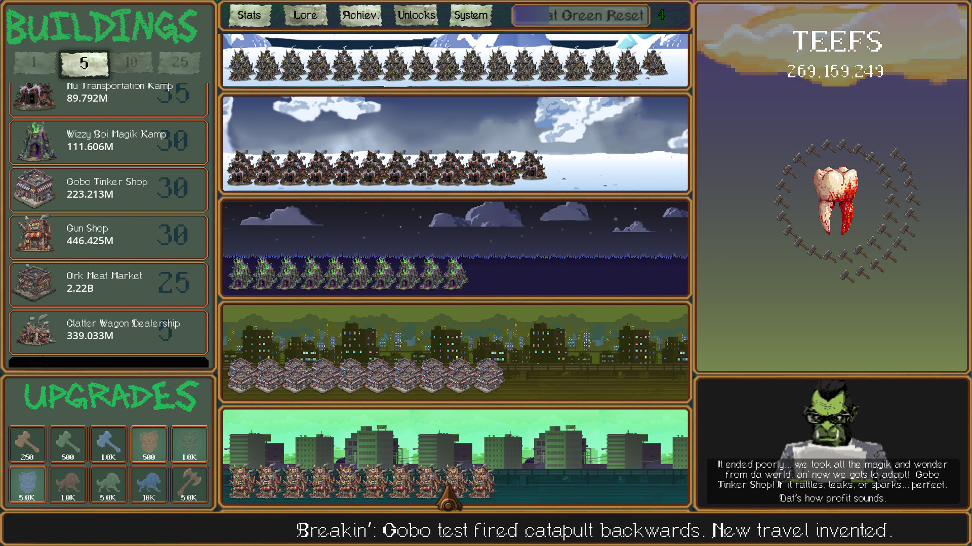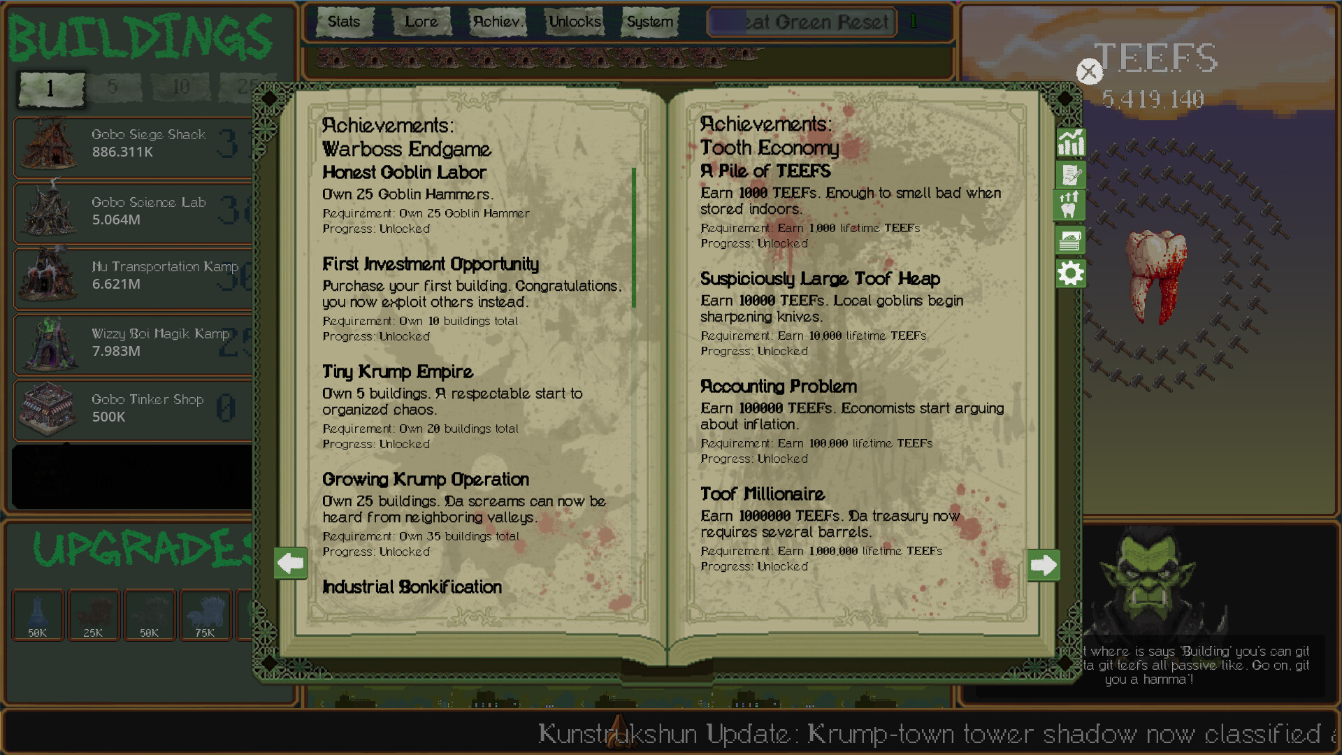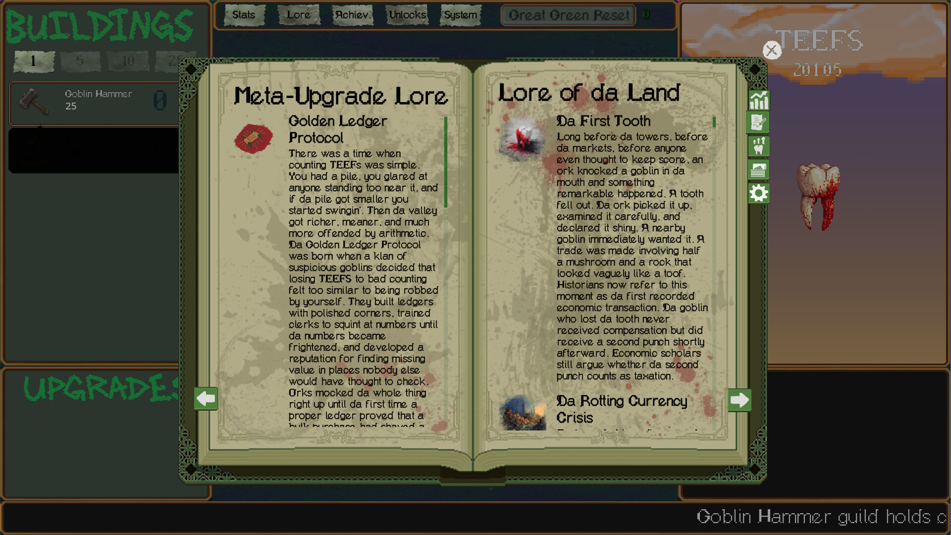 TEEFS is a goblin and ork themed idle clicker where you build a wildly unethical TEEFS based economy from the ground up. Click for TEEFS, buy increasingly absurd businesses, stack upgrades, watch your production spiral into brutal, chaotic excess, and when you reach the peak of great green glory. Blow it up and do it again with more. More GREEN, more UPGRADES and MORE TEEFS! It’s fast, funny, deeply satisfying, and packed with the kind of number-go-up gameplay and a rich story that will have you coming back for more every time.
