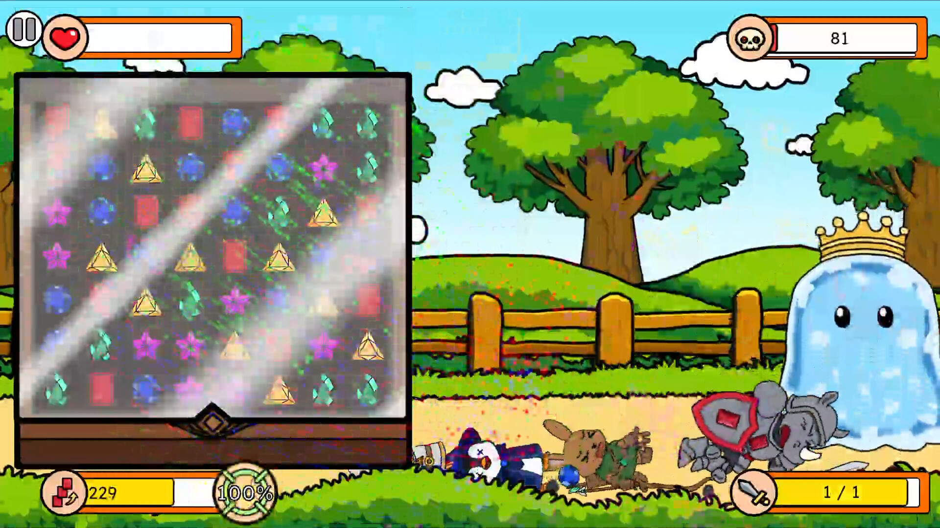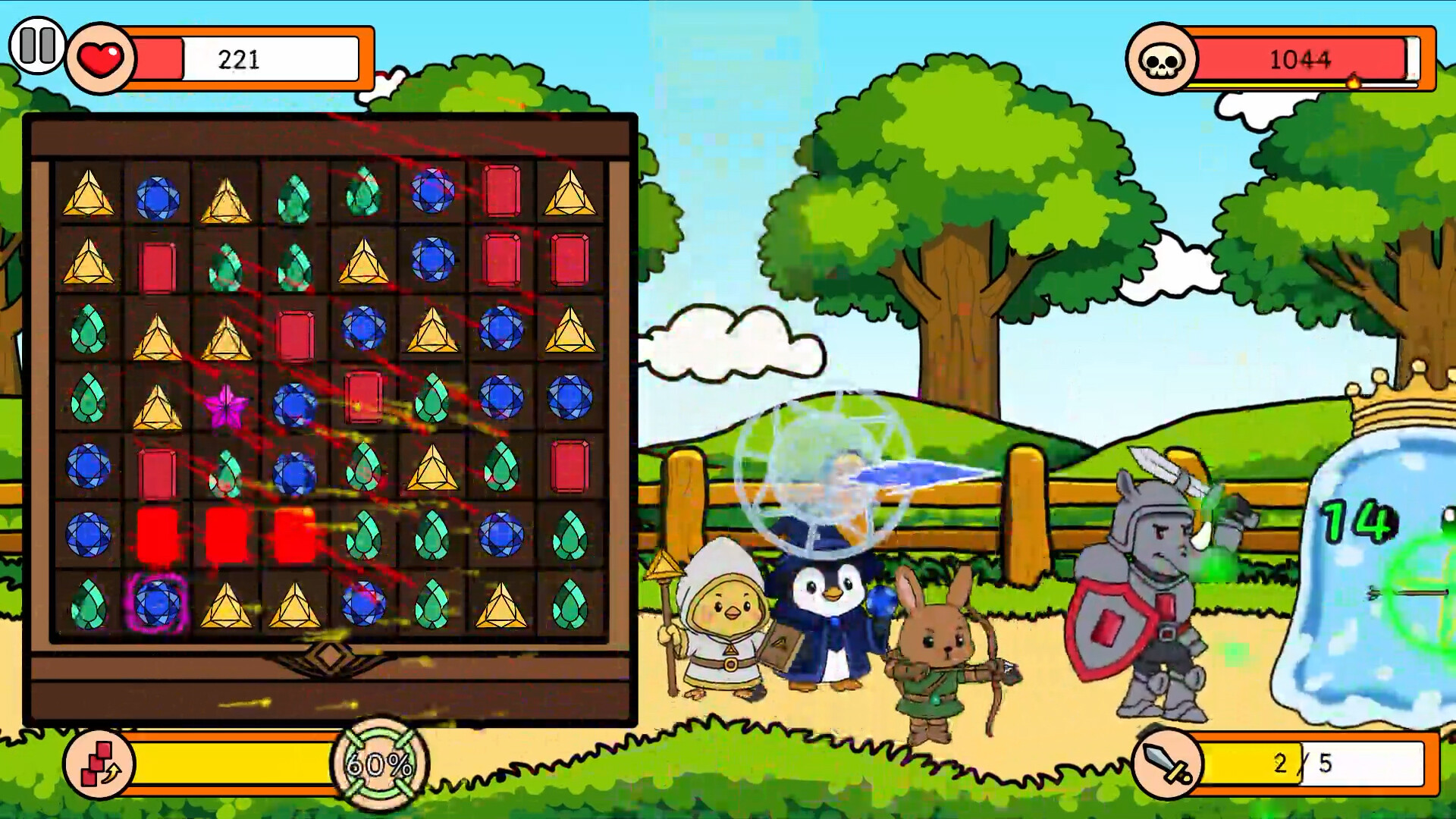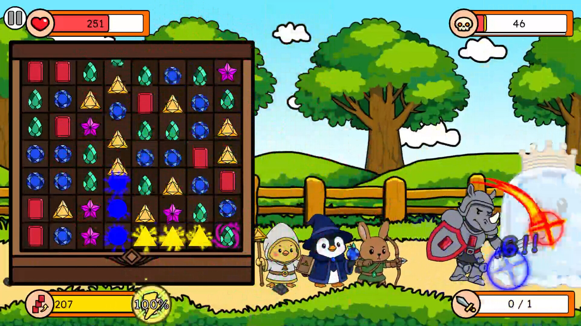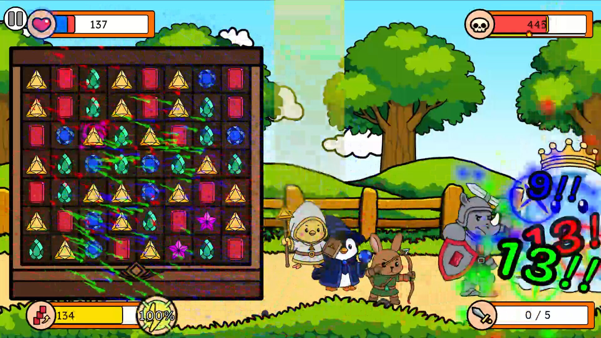 보석판에서 한가지 보석을 이동시켜 3가지 혹은 그 이상의 보석들을 같은 종류로 맞추면, 그 보석들이 결정화됩니다. 그렇게 결정화된 보석 에너지들을 끝없이 몰려오는 적들을 대항하기 위해 결성된 동물 친구들에게 전달됩니다. 빨간 보석은 코뿔소 기사, 초록 보석은 토끼 궁수, 파란 보석은 펭귄 법사, 노란 보석은 병아리 사제에게 힘을 부여합니다.
