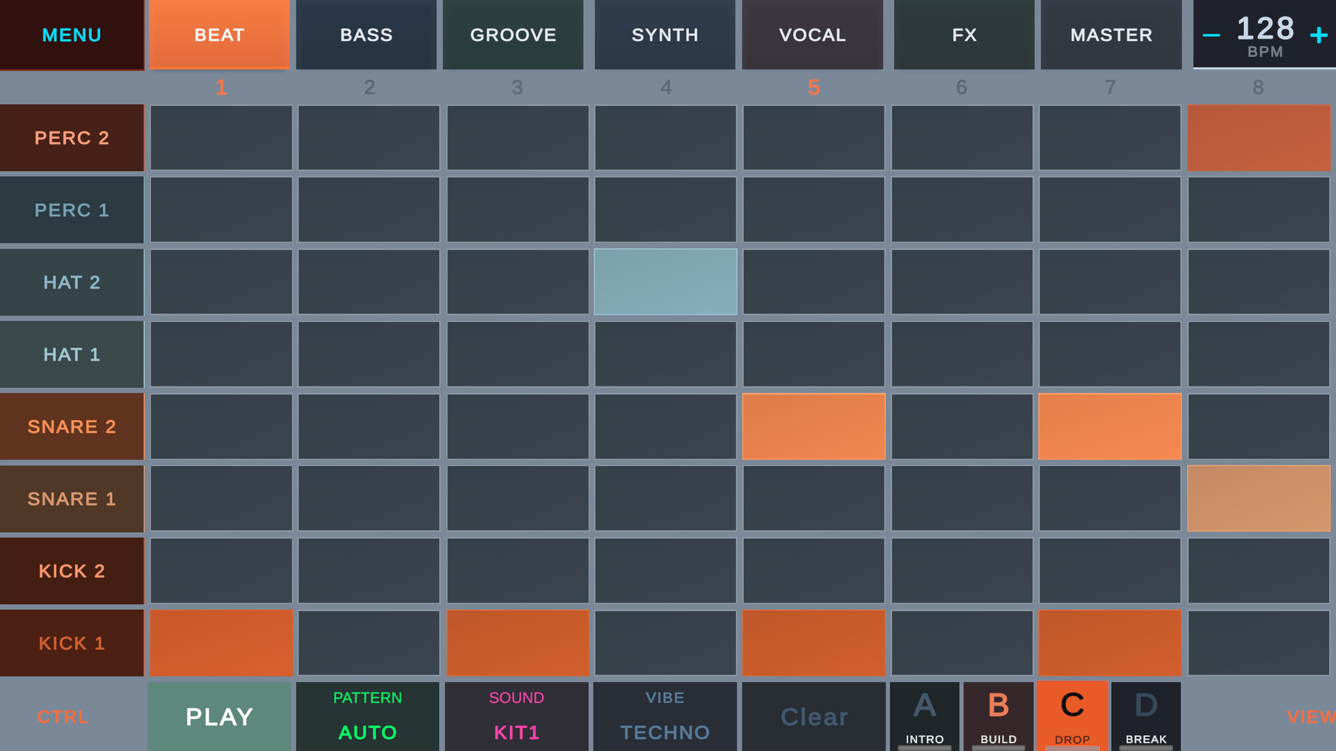Drums - kick, snare, hat, perc를 8개 트랙에