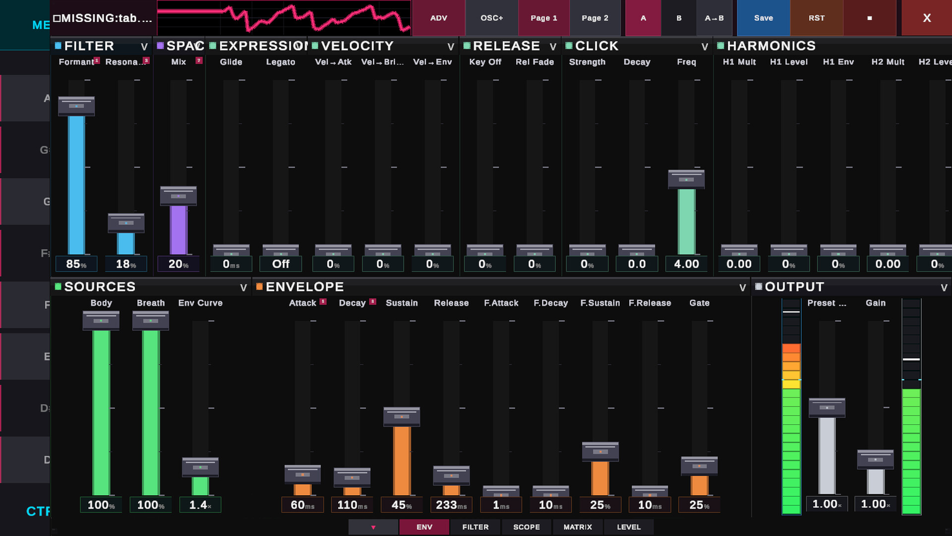 새추레이션, 리버브, 딜레이, 코러스, 페이저 등 90개 이상의 파라미터와 이펙트로 완전한 악기 컨트롤