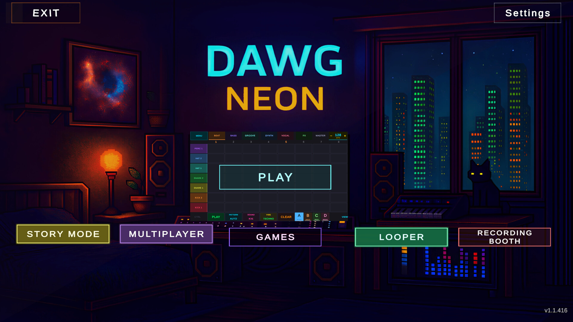 아케이드 모드 - DAWG 내부의 리듬 게임 (드럼 또는 노트 중심 — Guitar Hero 스타일)