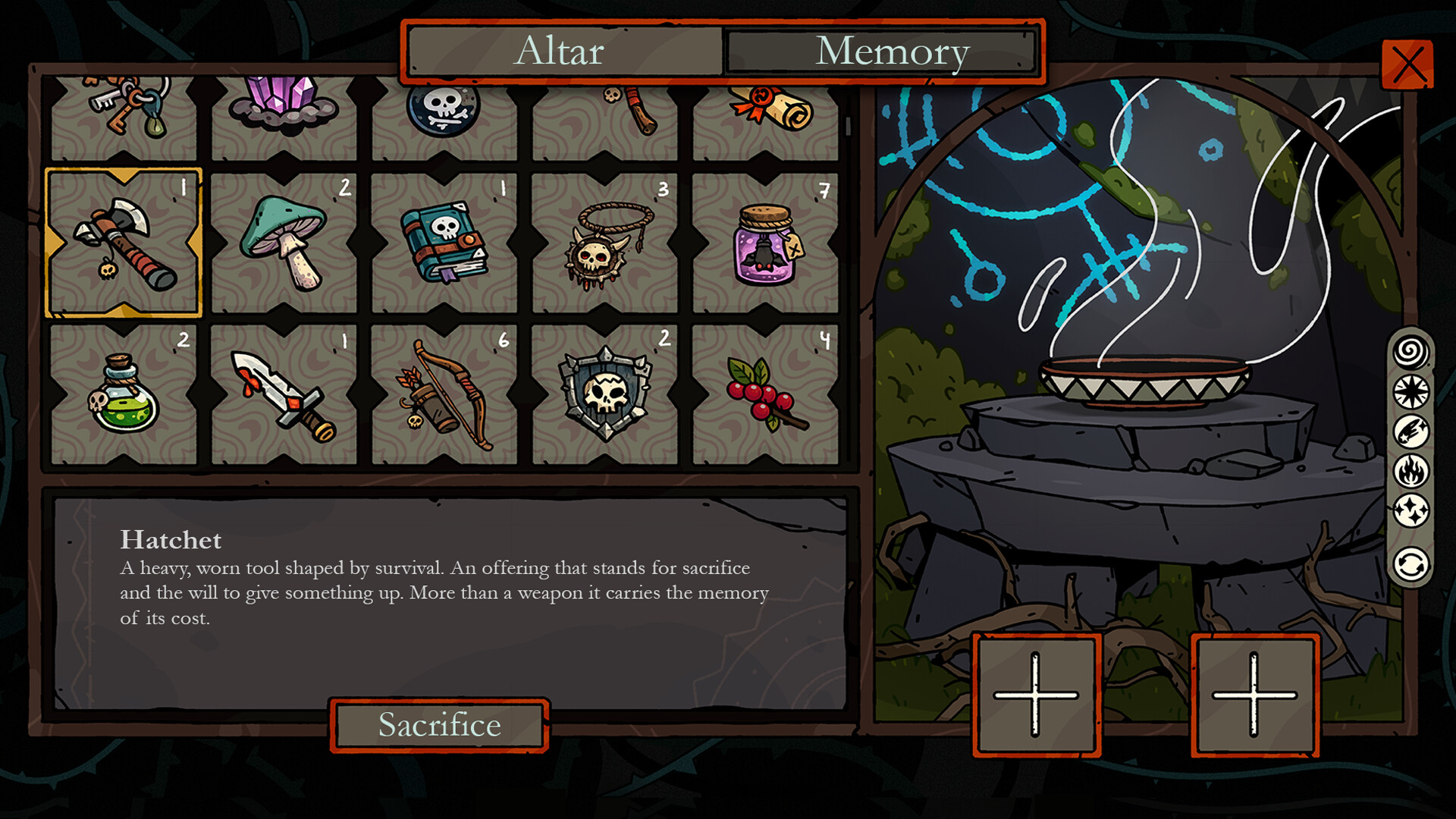 Everything that happens by the bonfire is a ritual. Offerings at the altar determine who will emerge from the flames, how the weather will change, and what sounds will fill the silence. Some items unlock the path to new characters. Others change the balance of the game. Experiment! The results may surprise you.