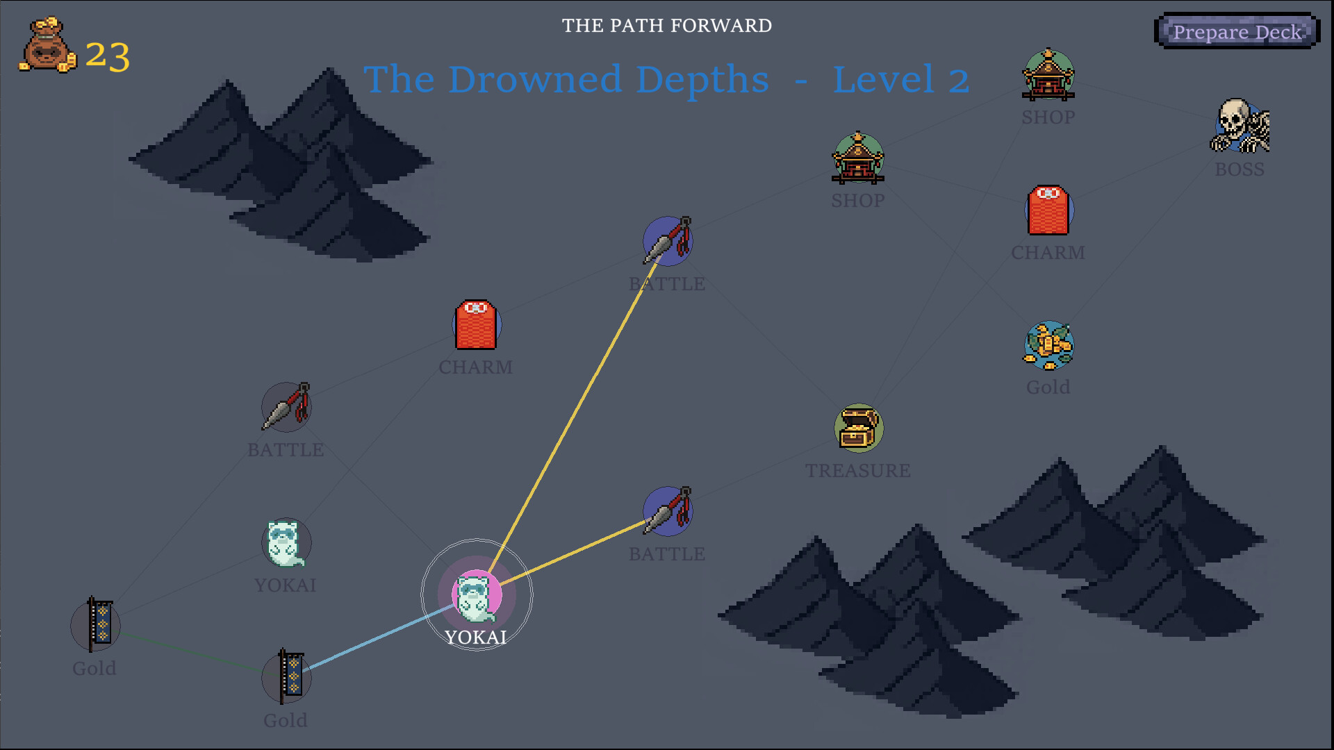 Navigate a branching underworld where every node is a gamble. Will you seek to avoid conflict or accumulate power at every chance? Every path leads deeper into the dark, culminating in boss battles against legends like the eight-headed Yamata-no-Orochi or the skeletal Gashadokuro.