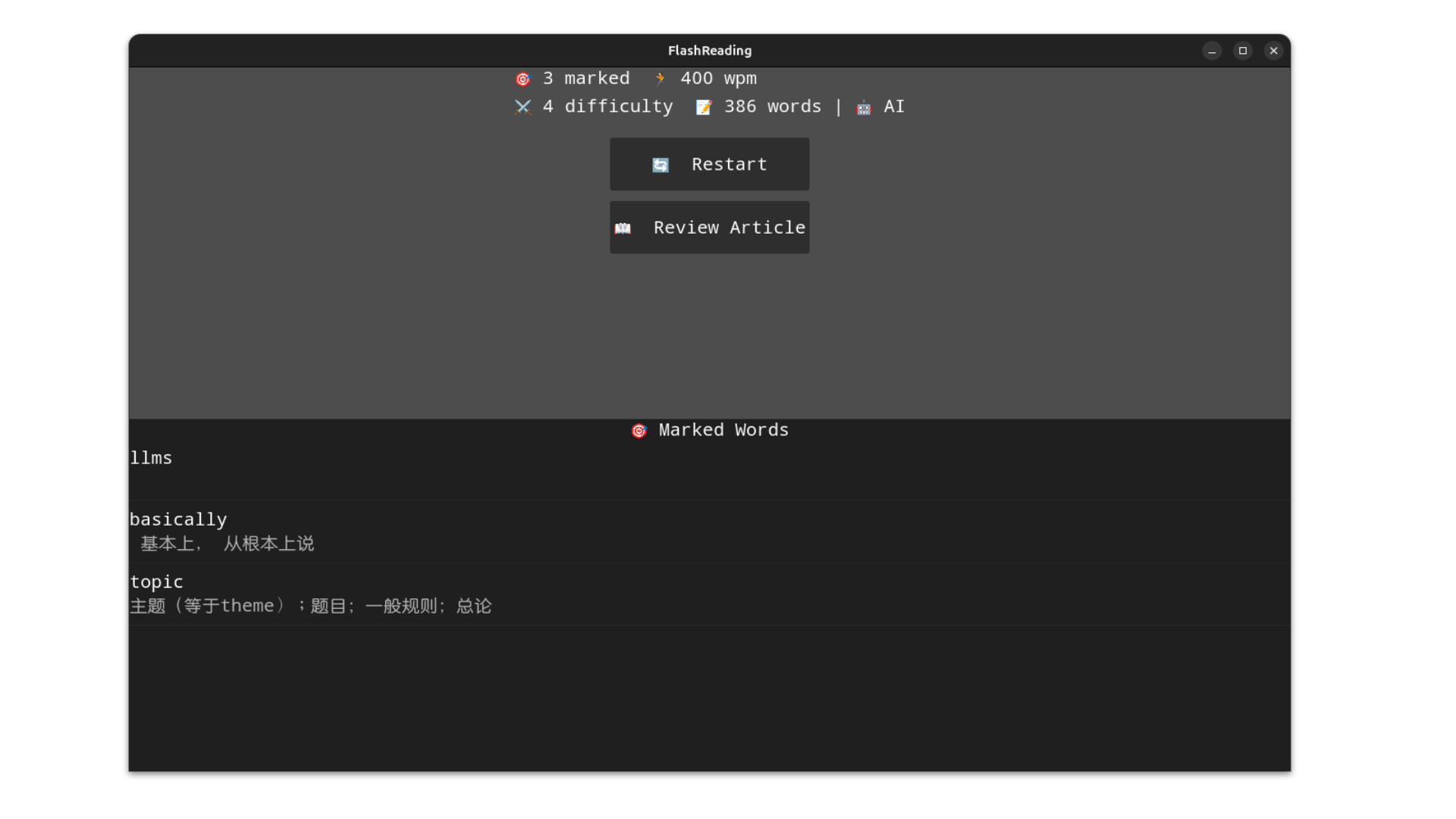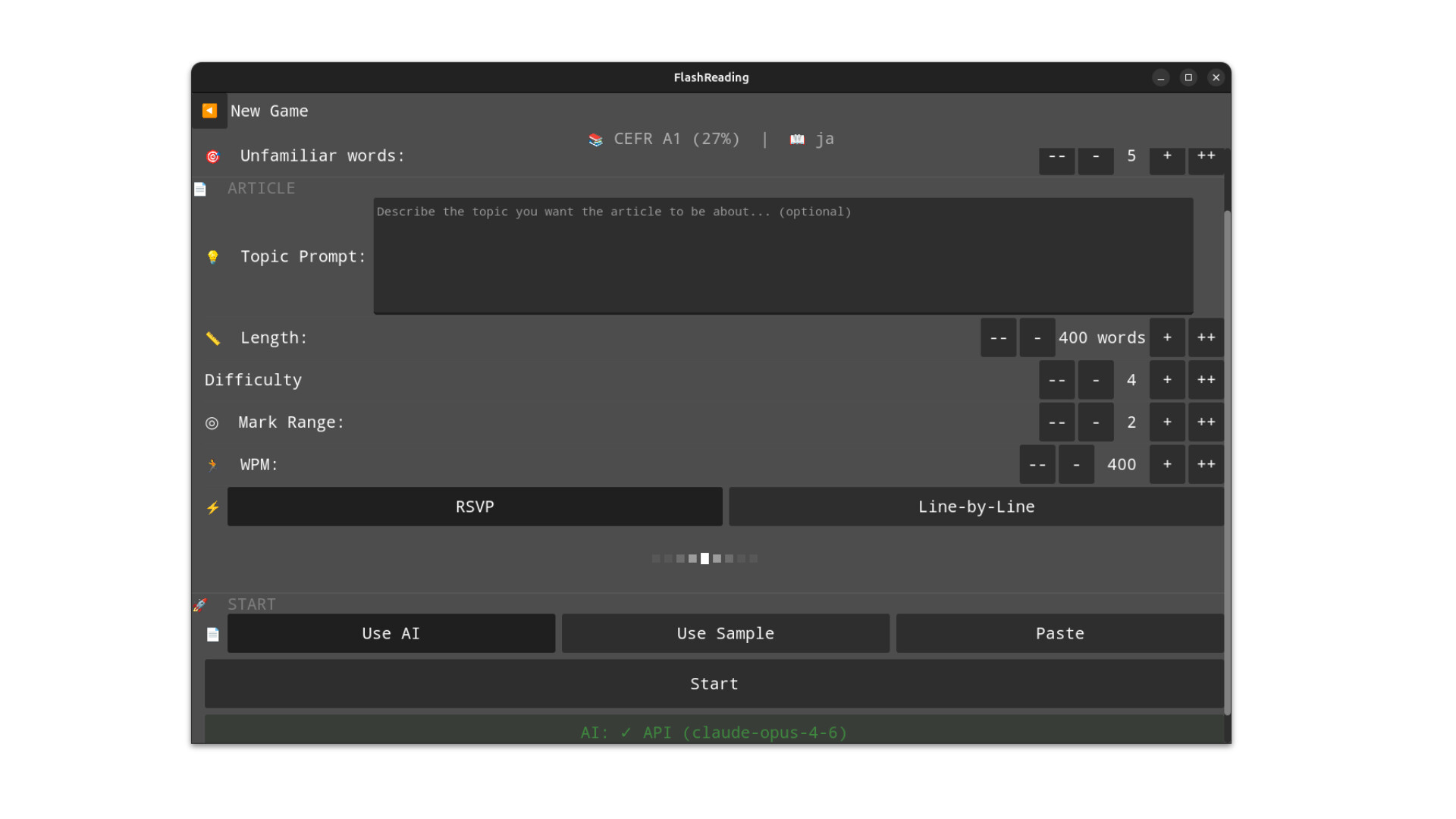 FlashReading은 실시간으로 어휘 수준에 적응하는 지능형 독서 트레이너입니다. RSVP(빠른 연속 시각 제시)와 AI 생성 콘텐츠를 사용하여 읽기 속도를 높이는 동시에 모든 낯선 단어를 추적합니다 — 훈련하면서 배울 수 있습니다.
