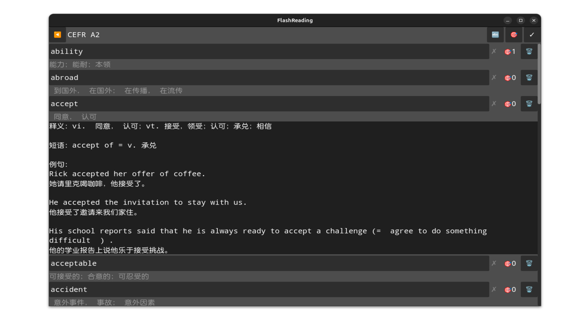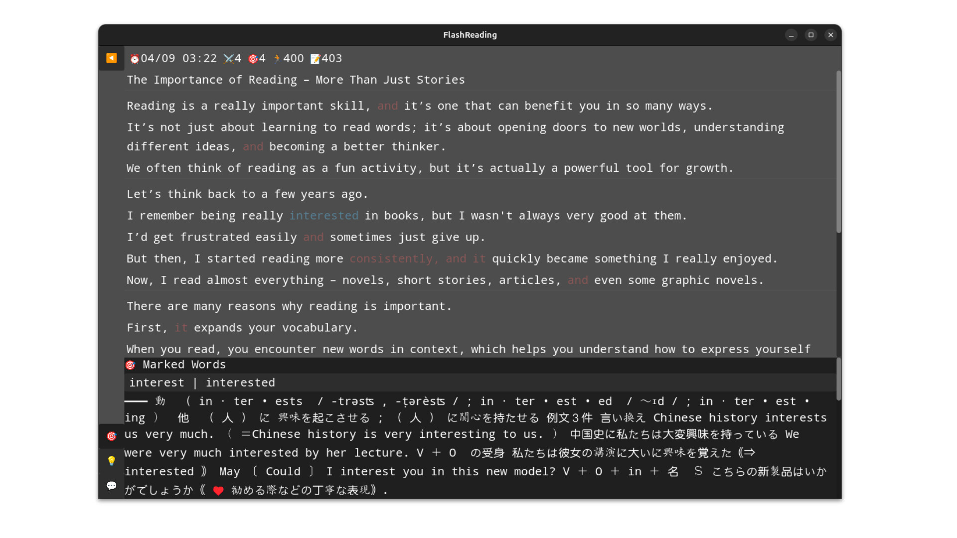 FlashReading은 사전 전체에서 단어 친숙도를 추적하고 수준에 맞춘 기사를 생성합니다: