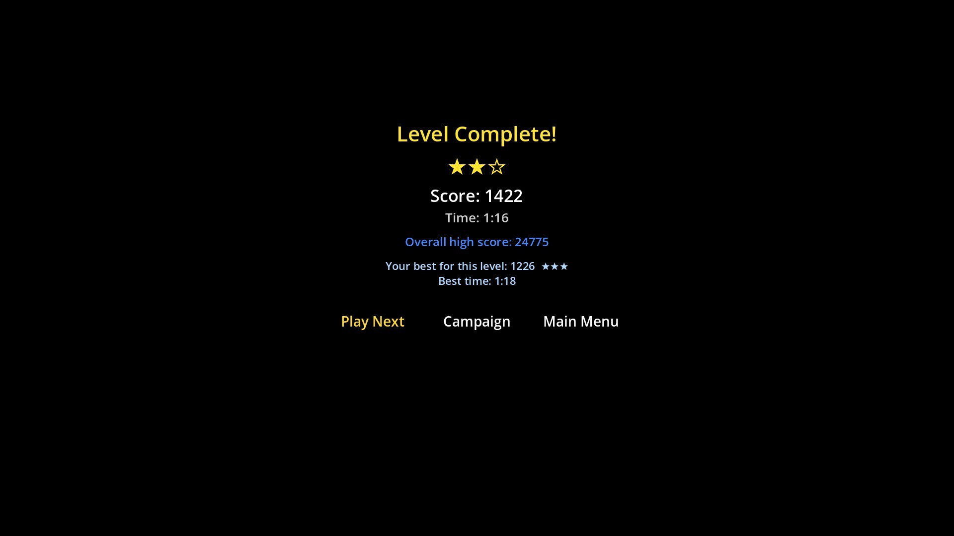 A 119 level campaign is built in, with most of the levels taking 2-5 minutes to complete; around 7 hours for a first pass through the full campaign but with the challenge settings changing how they play there's plenty of replayability even if you don't find yourself trying to beat your best time or highest score.