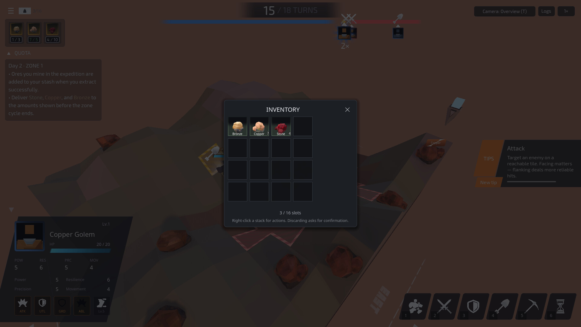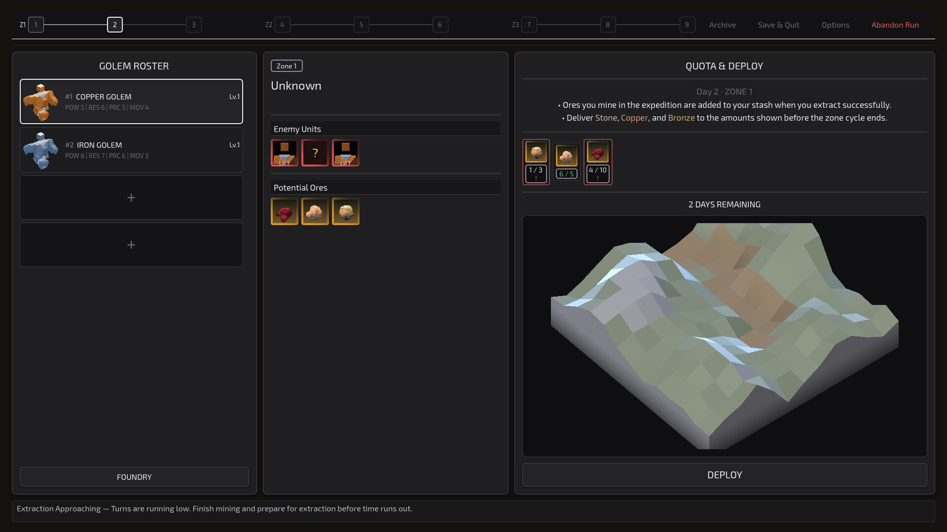 The Foundry - Use extracted ores like Copper, Iron, and Gold to construct new golems and maintain a squad of up to 4 units.