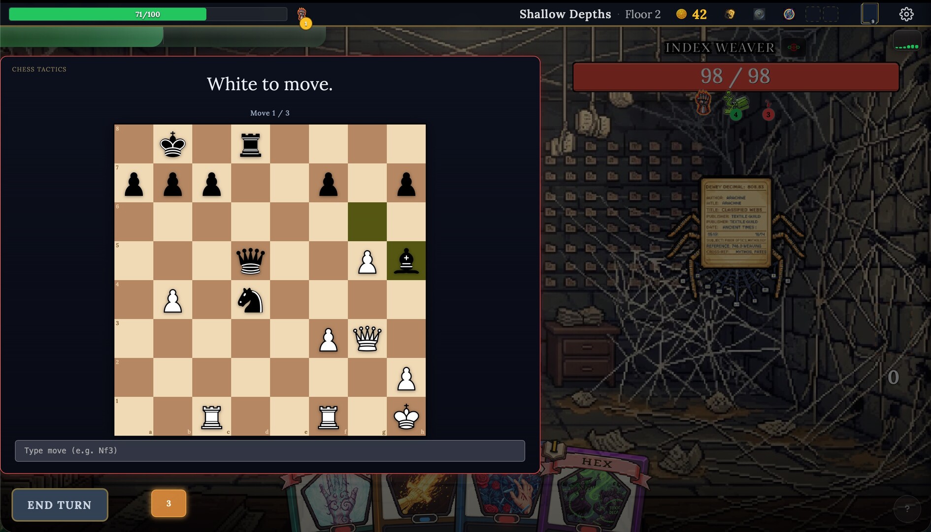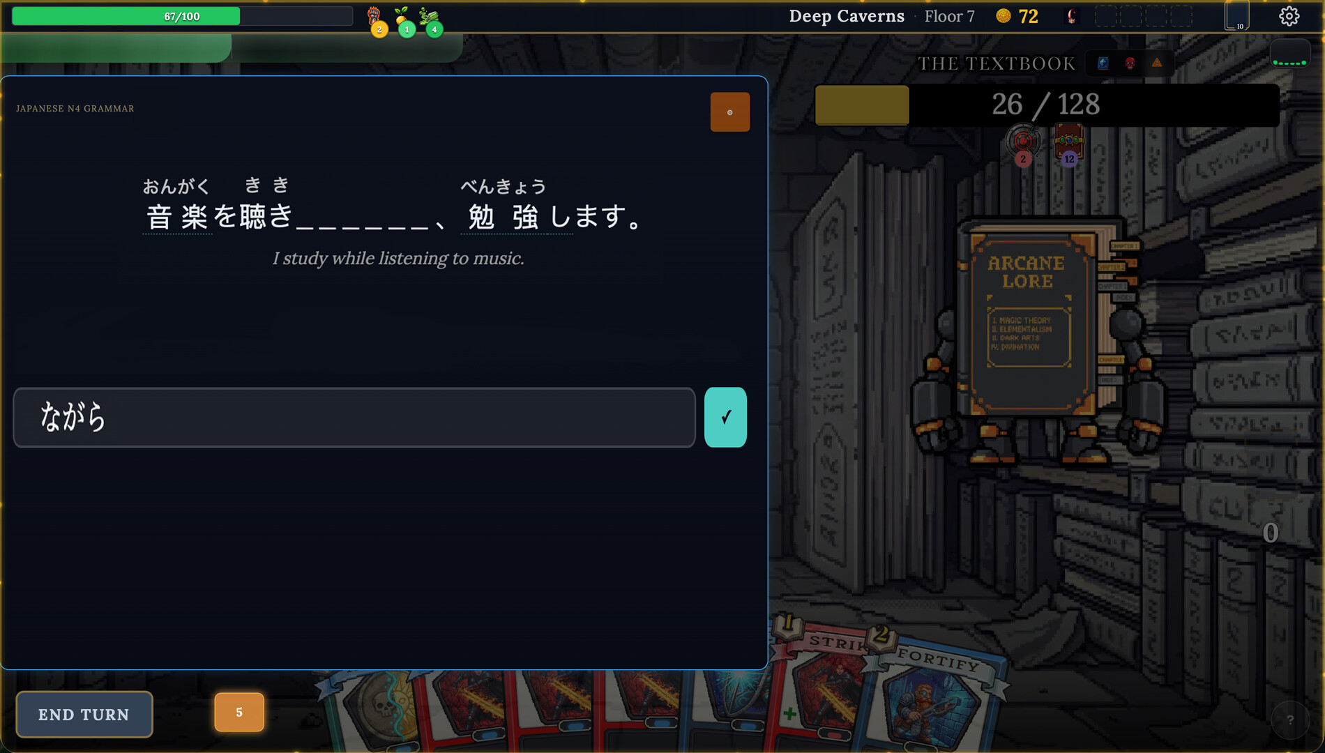 - 98 card mechanics across 6 types. Strikes, shields, hexes, buffs, debuffs, wild cards. Mastery levels 0-5 that scale as you answer correctly.