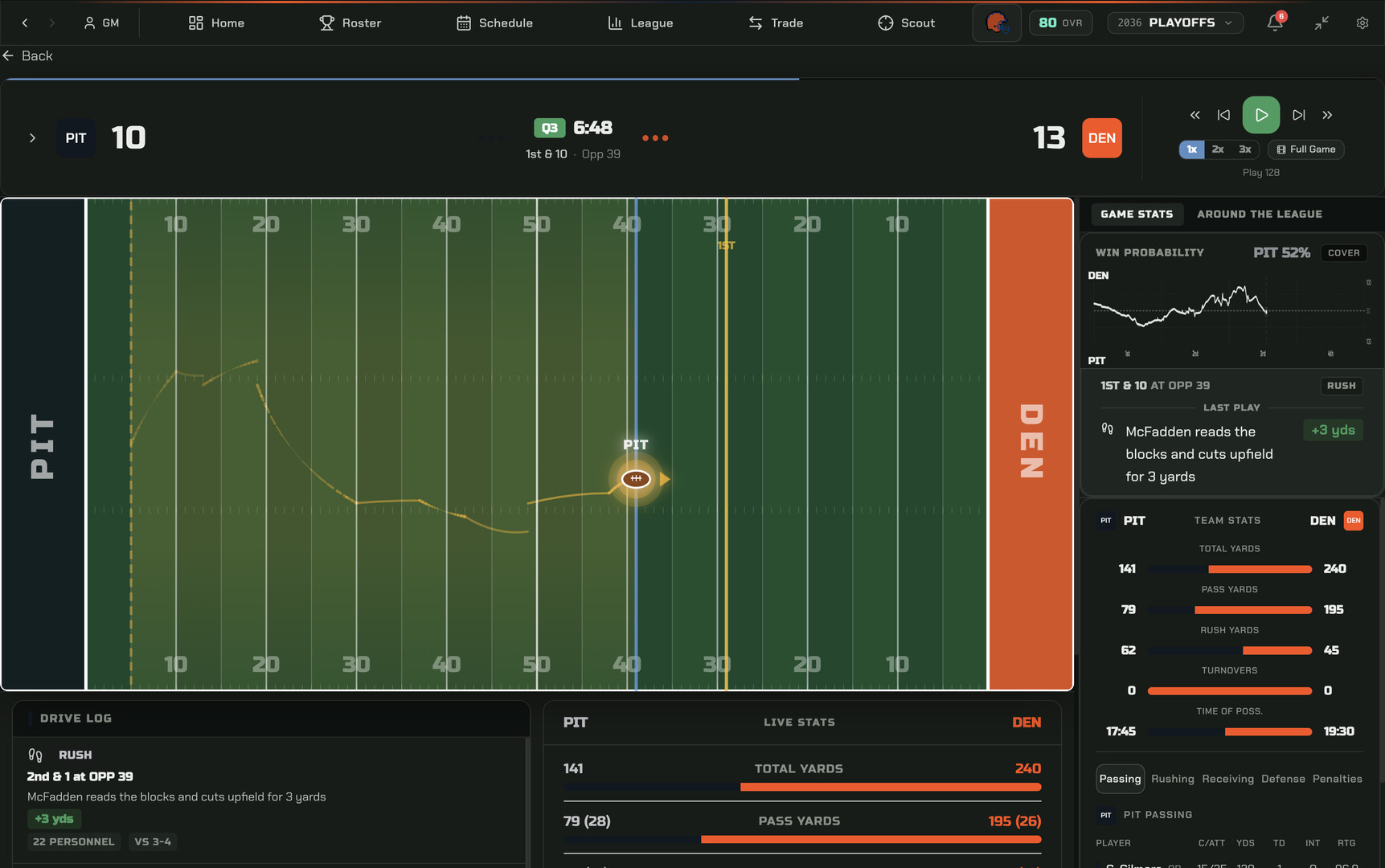 Simulate games with a play-by-play engine calibrated against real professional football data. Watch drives unfold on a field view with live win probability chart, drive logs, and broadcast-style presentation. Every player attribute, from throw power to route running to block shedding, even a lineman's arm length or a running back's weight, feeds into outcomes on every snap.