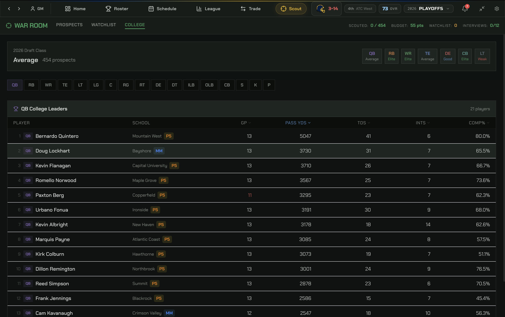 Scout hundreds of prospects each year through a multi-layered scouting system. Spend scouting points to reveal hidden attributes, attend the combine for measurables, conduct interviews to assess personality, and track college stats as they drop throughout the season. On draft night, field live trade offers and find your franchise cornerstone, or miss on a bust.