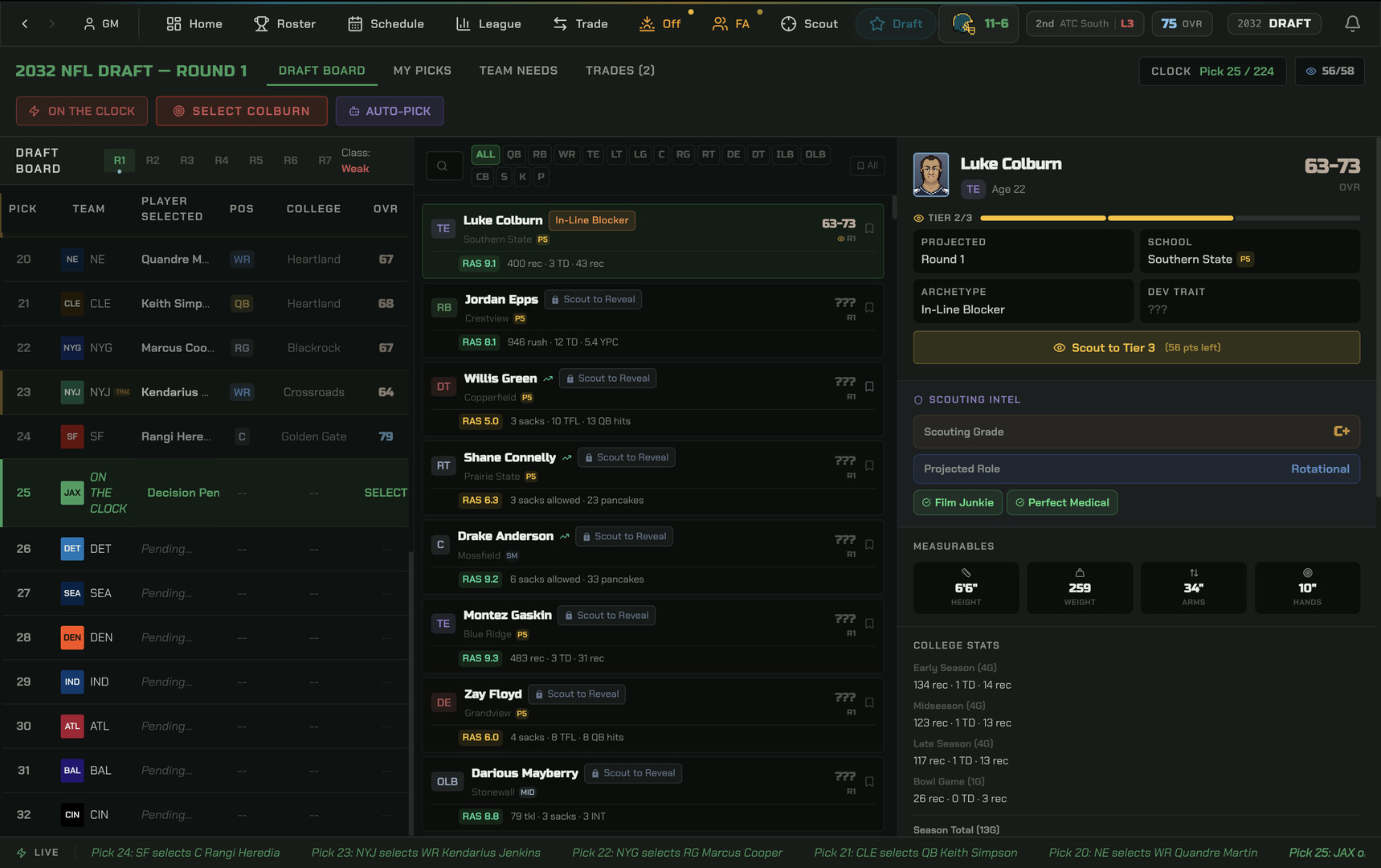 7-round draft with scouting, combine, interviews, and draft-day trades