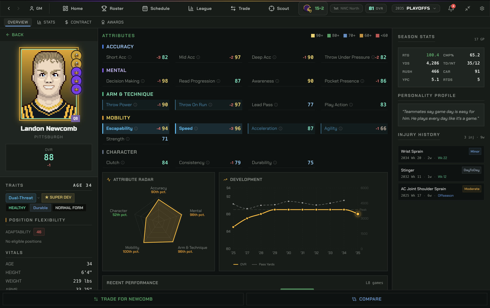 Players grow and decline on realistic career arcs with position-specific peak ages. Different development traits accelerate growth and training camp events create breakout moments. Watch a late-round pick blossom into an All-Pro, or a top prospect flame out.