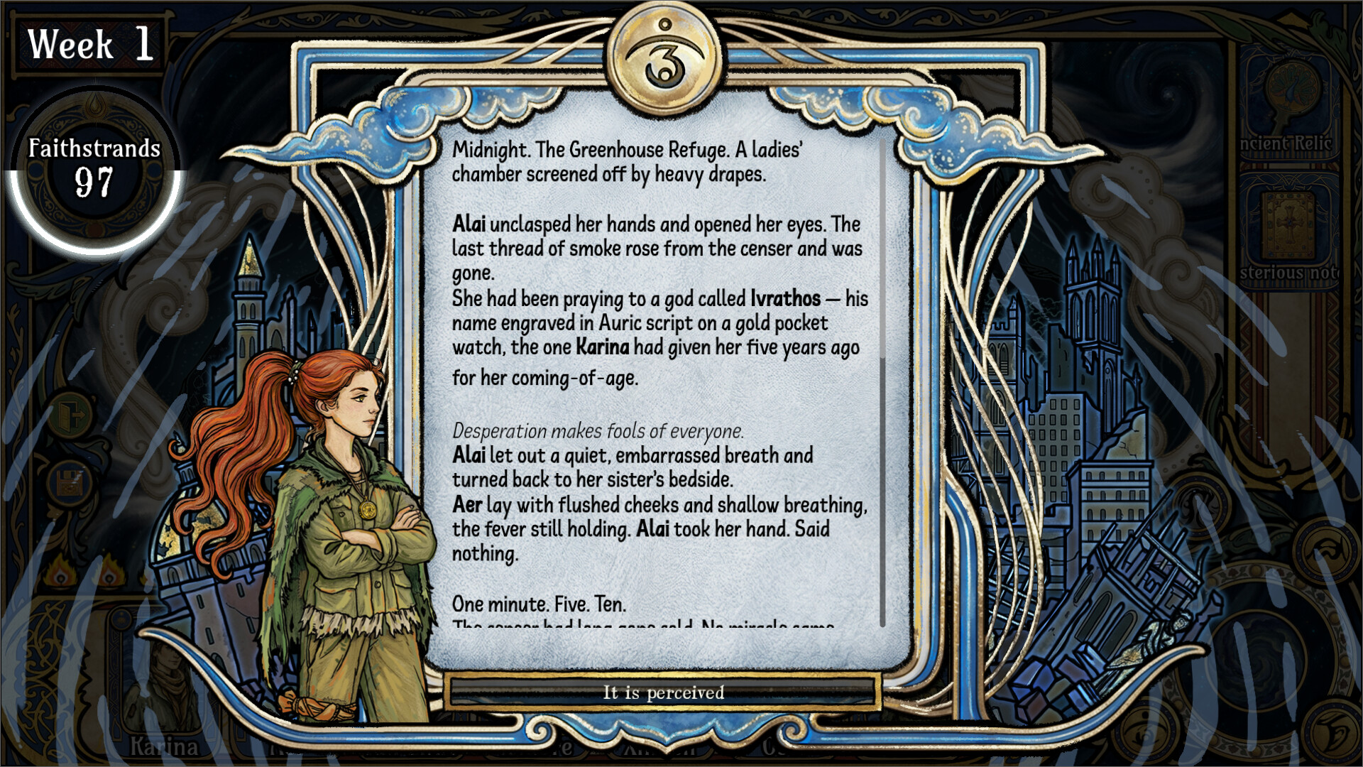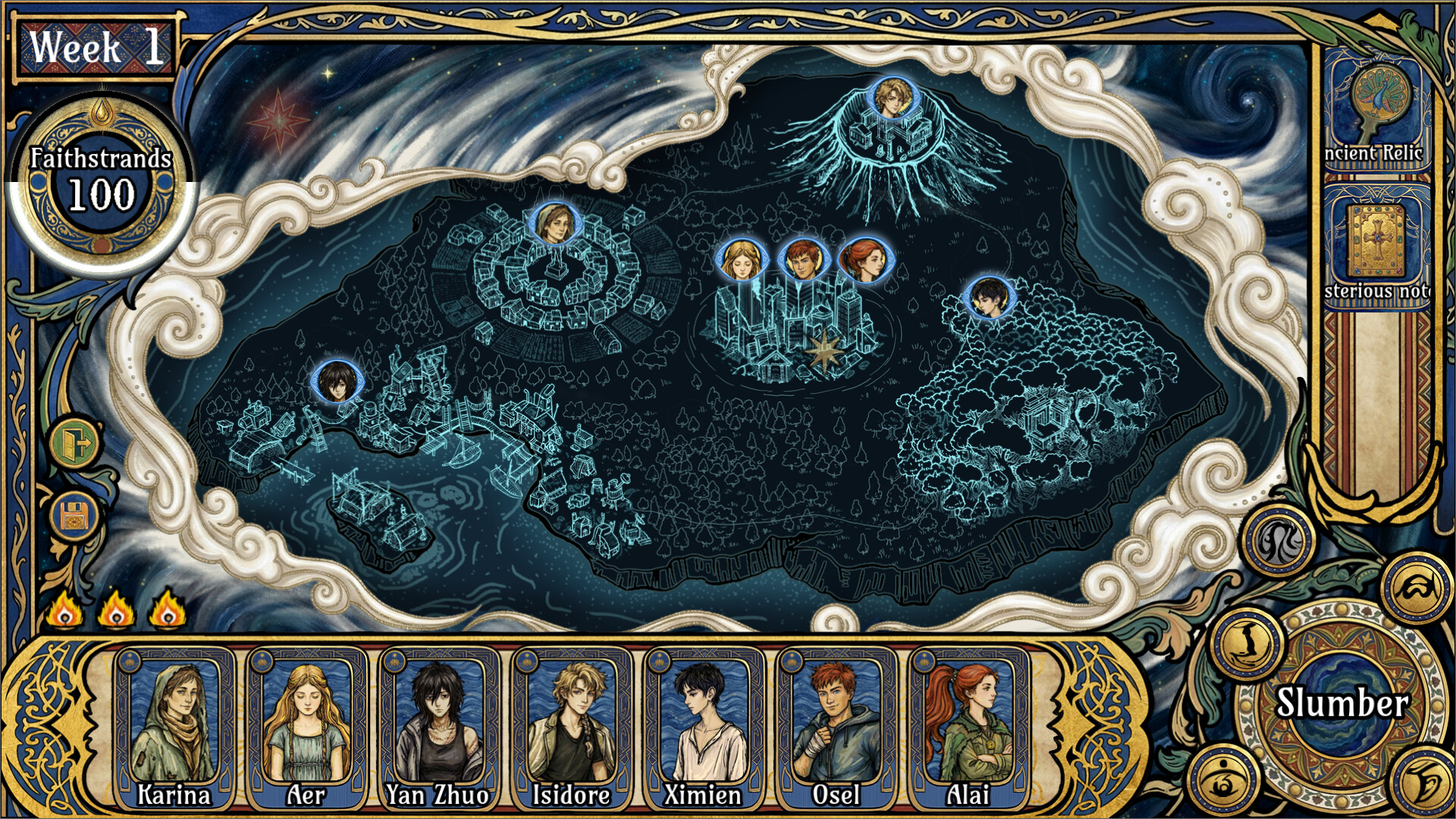 In your weakened state, your power is not infinite. You awaken only once a week, and every moment you remain conscious consumes the Faithstrands that sustain your Primal Consciousness. Should they reach zero, you will return to an endless silence.